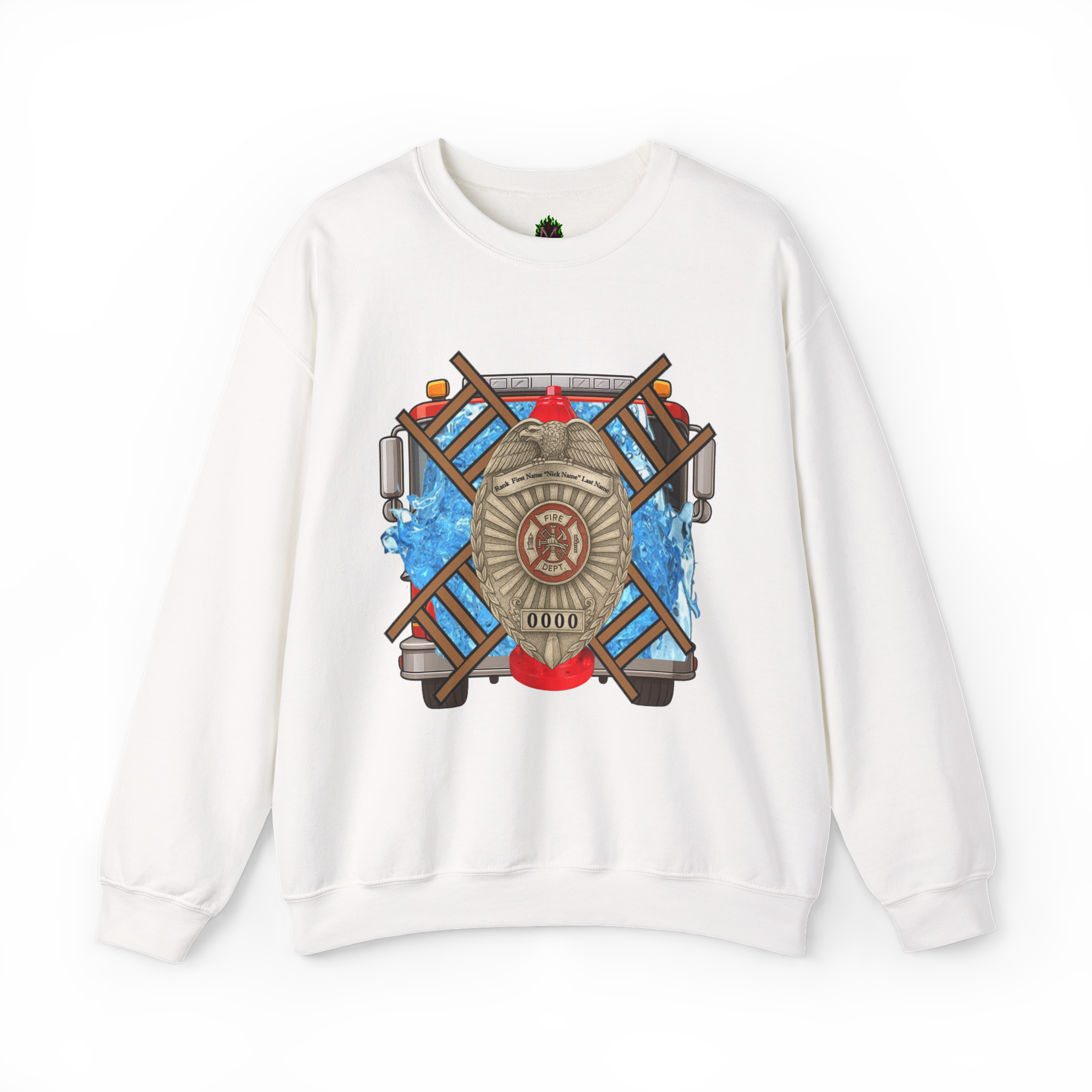 A heartfelt firefighter tribute crewneck with bold front graphics and an emotional back design.