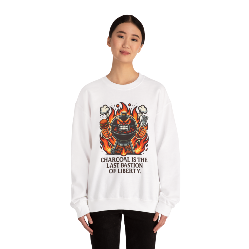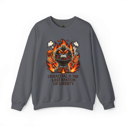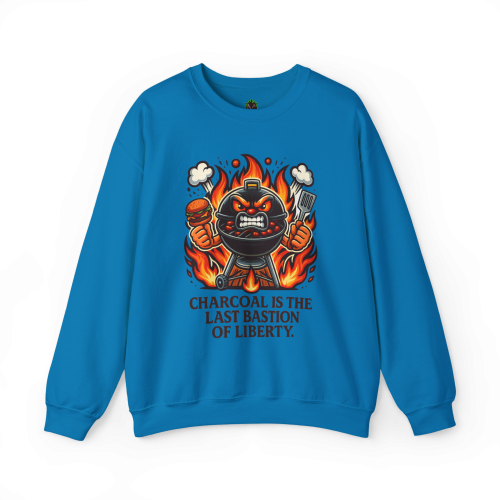 This crewneck brings the heat—literally and ideologically. Front and center: an enraged cartoon charcoal grill, fists clenched, flames raging, clutching a burger in one hand and a spatula in the other. The statement beneath it doesn’t just sizzle—it shouts: "Charcoal is the last bastion of liberty."