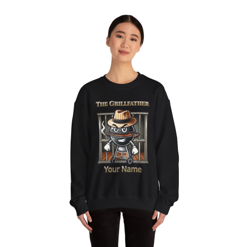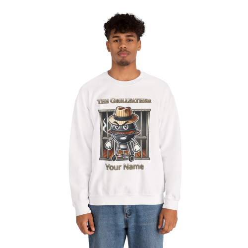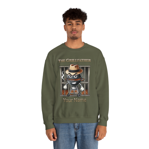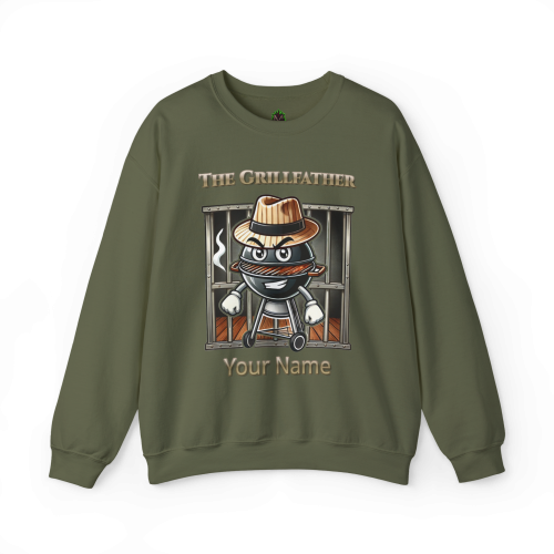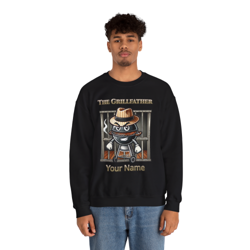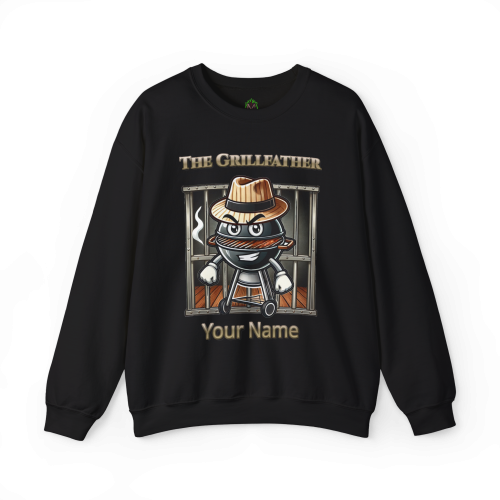 Step into the role of the BBQ boss with “The Grillfather” crewneck sweatshirt. The charcoal gray backdrop frames an unforgettable front design — a cartoon grill with a stern mob-boss face, rocking a tan fedora, puffing a cigar, and standing in front of prison-style bars. Metallic gold lettering spells out The Grillfather above, with space to add your own name for that personal touch.