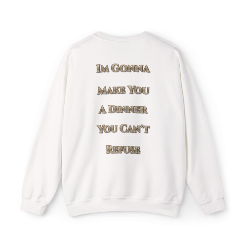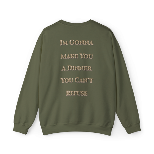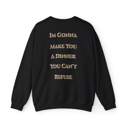 The back drives the point home with a bold declaration in gold text: “I’m gonna make you a dinner you can’t refuse.” Crafted for comfort and style, this sweatshirt is the ultimate attire for backyard cooks, BBQ competitors, and anyone whose grill skills are the stuff of legend.