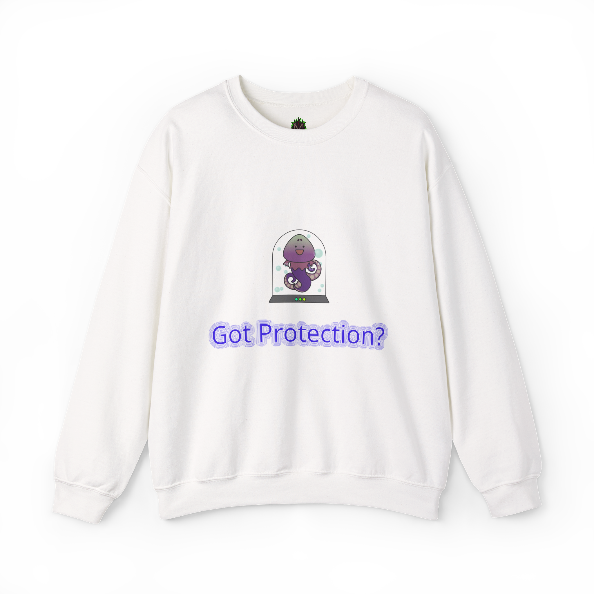 From bubble boys to doomsday preppers, this one's for you. The "Got Protection?" crewneck sweatshirt features an adorable/unnerving tentacled blob locked in its own high-tech containment pod. It’s a hilarious nod to our collective paranoia, biohazard prep, and personal space issues.