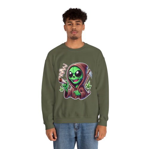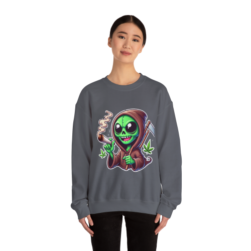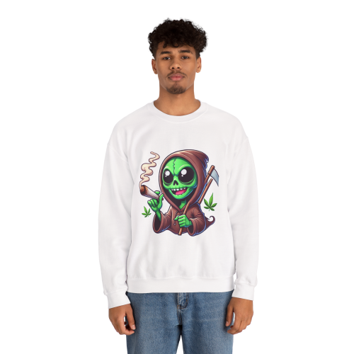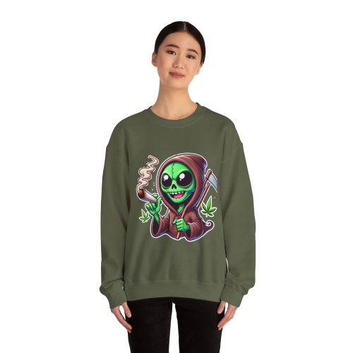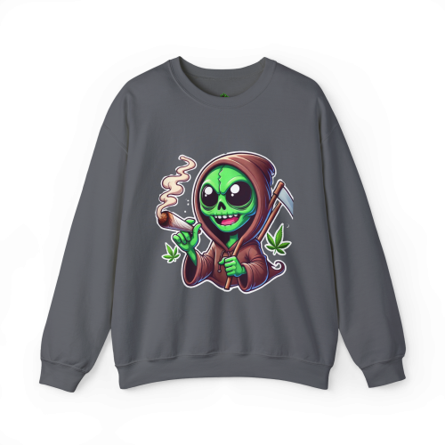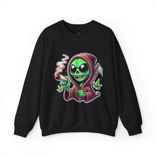 This otherworldly grim reaper blends extraterrestrial charm with interstellar chill, rocking a classic reaper’s robe, a sly smile, and a freshly lit joint. Cannabis leaves float around for an extra dose of green goodness.