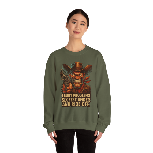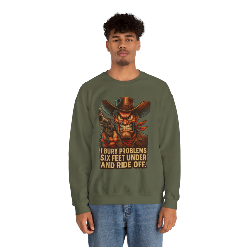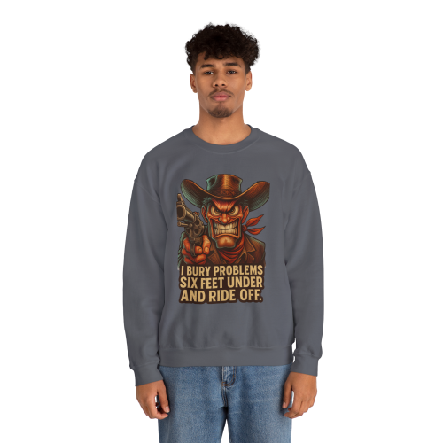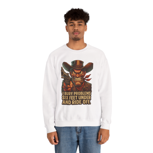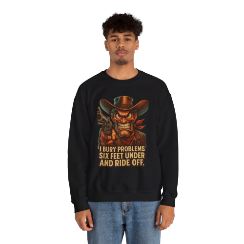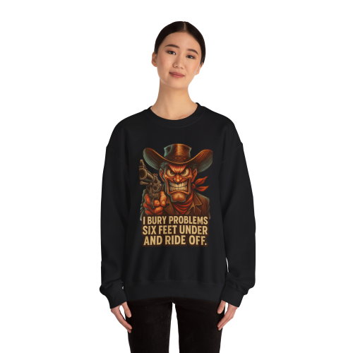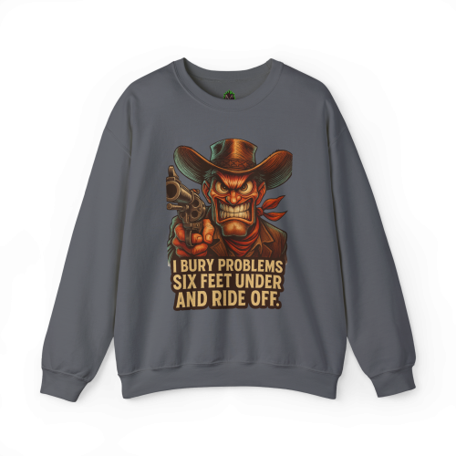 This crewneck sweatshirt delivers outlaw vibes with a punch of dark humor. The design features a fierce, grinning cowboy aiming a revolver straight ahead, paired with the fearless words: “I Bury Problems Six Feet Under and Ride Off.”