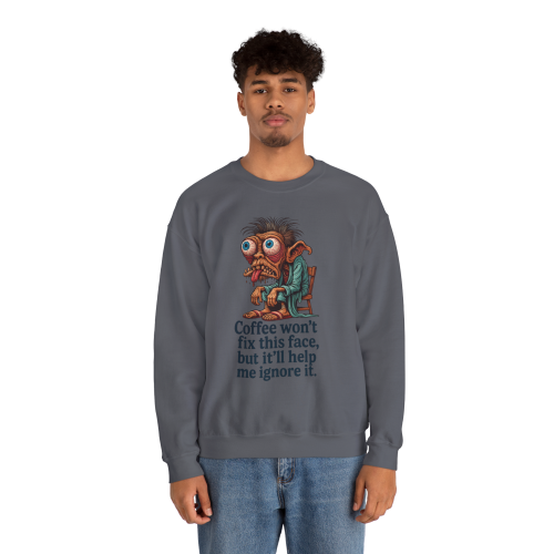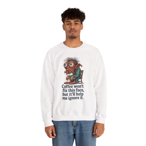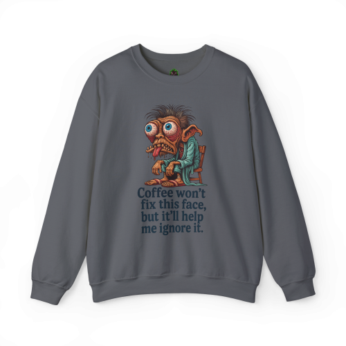 You ever look in the mirror and immediately wish you hadn’t? This sweatshirt captures that exact vibe—with a grotesquely hilarious character that screams unfiltered morning horror. Perfect for caffeine addicts, antisocials, and anyone who leans into their ugly with a sense of humor. Because coffee may not be magic—but it sure helps you fake it.