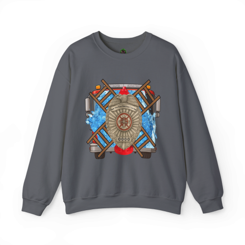 **Front Design:** A powerful fire truck graphic with crossed tools, a central firefighter badge, and a backdrop of vivid water splash effects—symbolizing readiness, skill, and dedication.