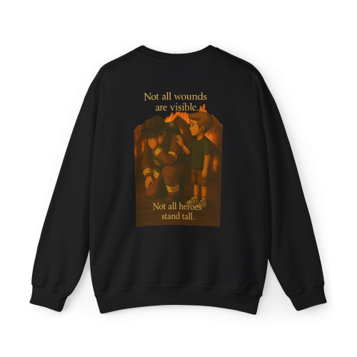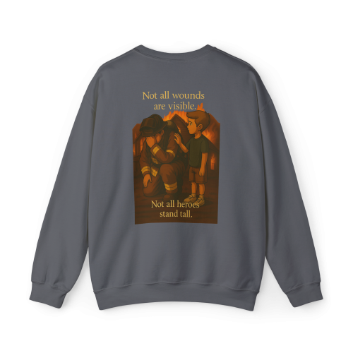 **Back Design:** An emotional scene of a firefighter sitting in exhaustion and grief, comforted by a child, with the words: “Not all wounds are visible. Not all heroes stand tall.”—a reminder of the unseen struggles behind the uniform.