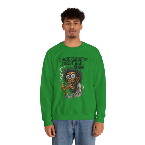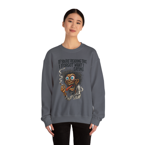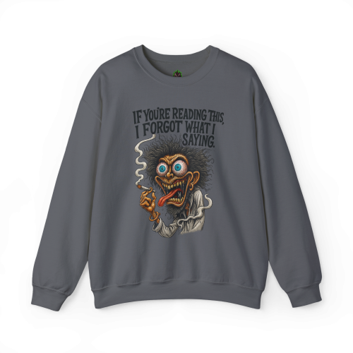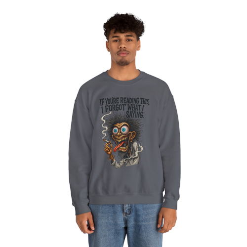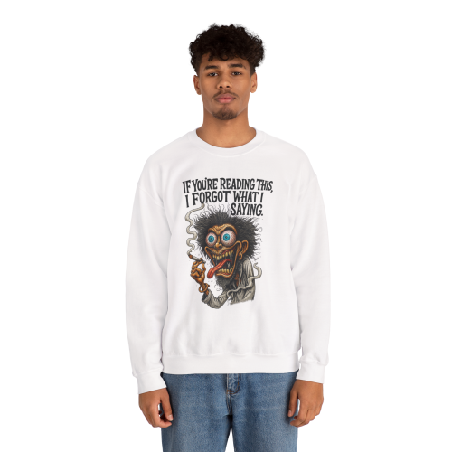 This is the sweatshirt for those of us who enter a room and instantly forget why. A frazzled, bug-eyed figure clutches a joint like it’s the only thing grounding him to this plane of existence. With the words “If you’re reading this, I forgot what I was saying” across the top, it’s a wearable brain fart in glorious graphic detail. Great for stoners, overthinkers, or anyone who’s mastered the art of the mental glitch.