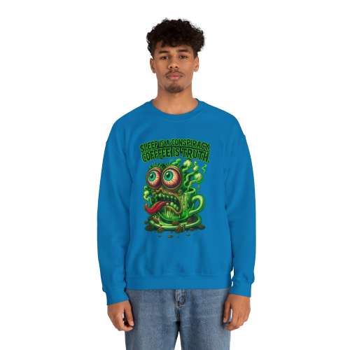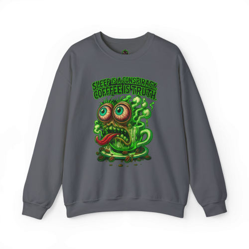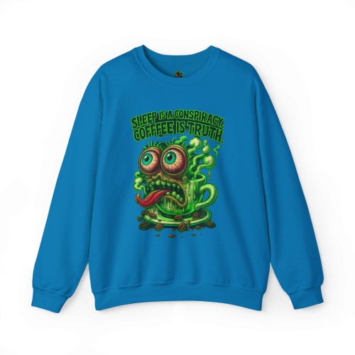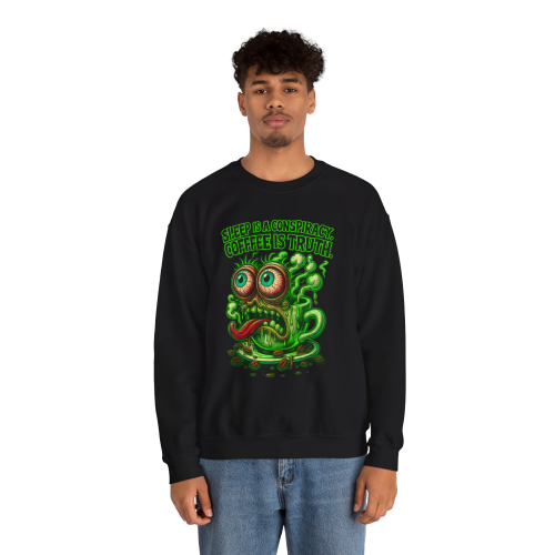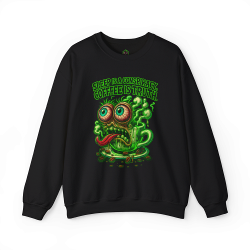 For the over-caffeinated truth-seeker, this crewneck features a wide-eyed, psychotic coffee cup monster who’s seen what lies beneath the beans. Bold green letters declare: Sleep is a conspiracy. Coffee is truth. Perfect for insomniacs, early risers, night owls, office zombies, and anyone who’s ever said, “I’ll sleep when I’m dead” while pouring cup #9. Sip hard. Wear harder.