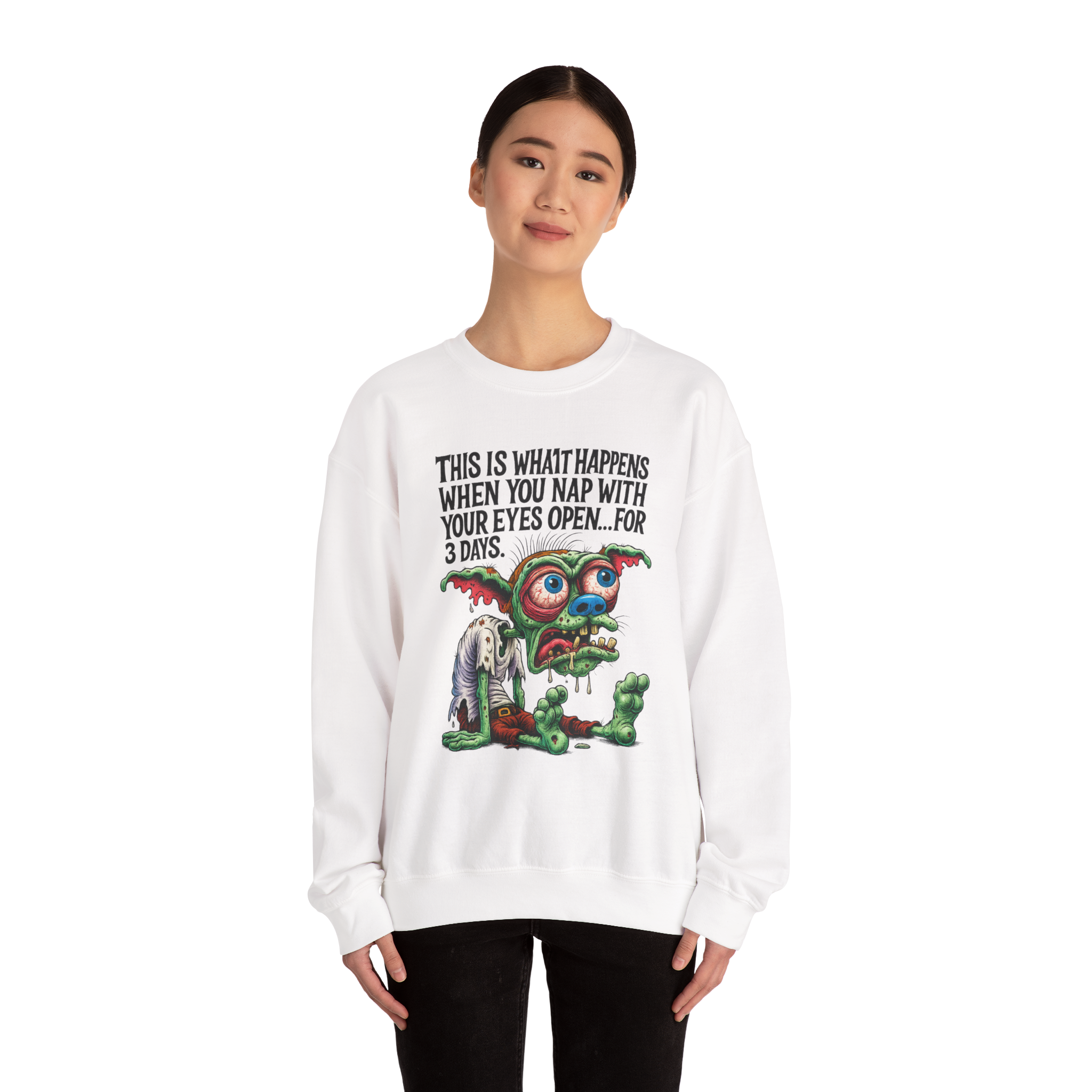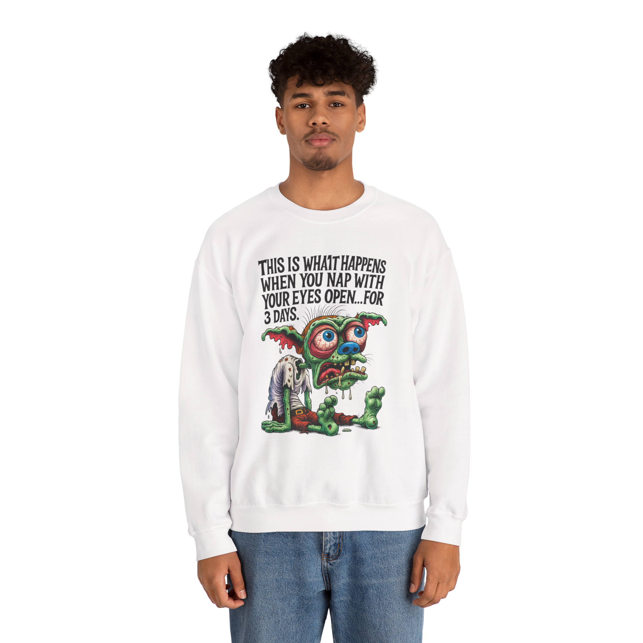 This white crewneck features a wide-eyed, brain-fried goblin who’s been “napping” with his eyes open for 72 straight hours—and it shows. Drool. Eyebags. Existential dread. All captured in colorful grotesque glory. Whether you're pulling all-nighters or just vibing in zombie mode, this design speaks your truth louder than your twitching eyelid. Perfect for insomniacs, caffeine casualties, and fans of monster chaos fashion.