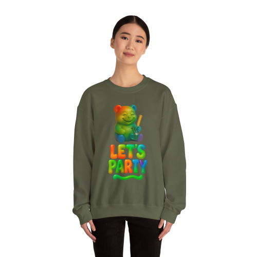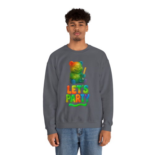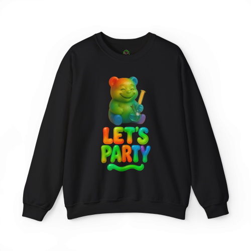 The design features a happy rainbow gummy bear holding a bong, paired with bold, colorful “Let’s Party” candy-style lettering. It’s bright, silly, and guaranteed to turn heads.