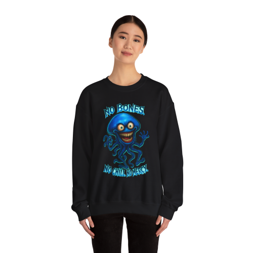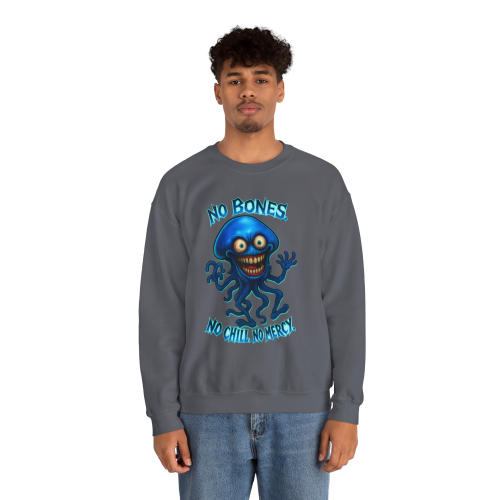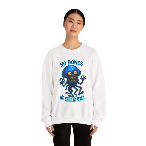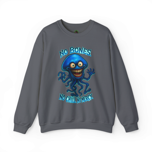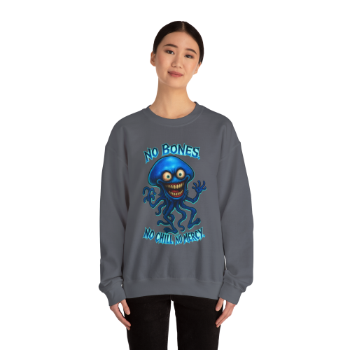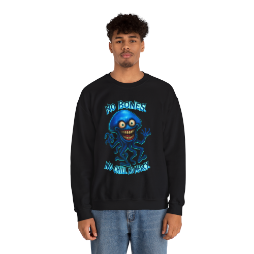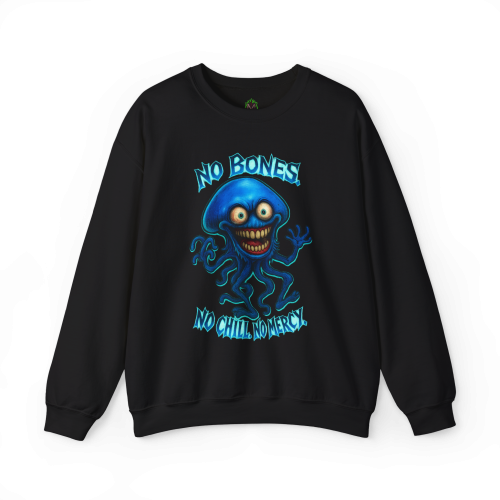 No Bones features a deranged, rubbery jellyfish-like creature with bugged-out eyes and a grin that means trouble. The chaos is locked in with bold text: