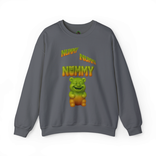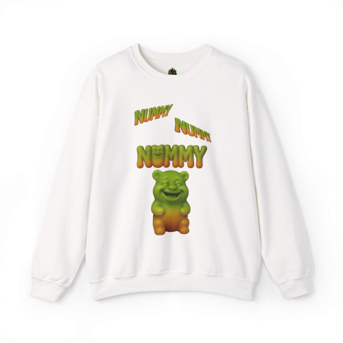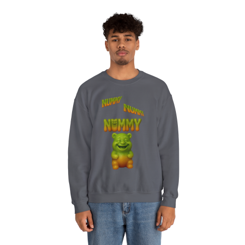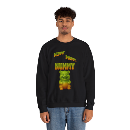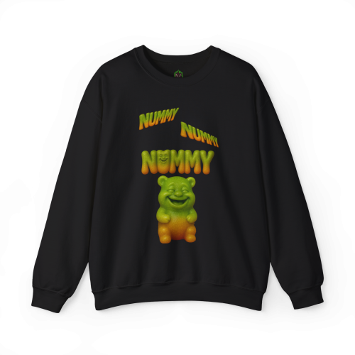 The design features a big, happy green-and-gold gummy bear under the layered words “Nummy Nummy Nummy” in sweet, colorful lettering. It’s bright, silly, and impossible not to love.