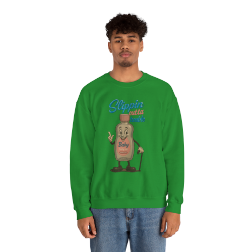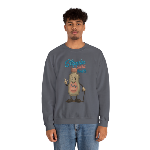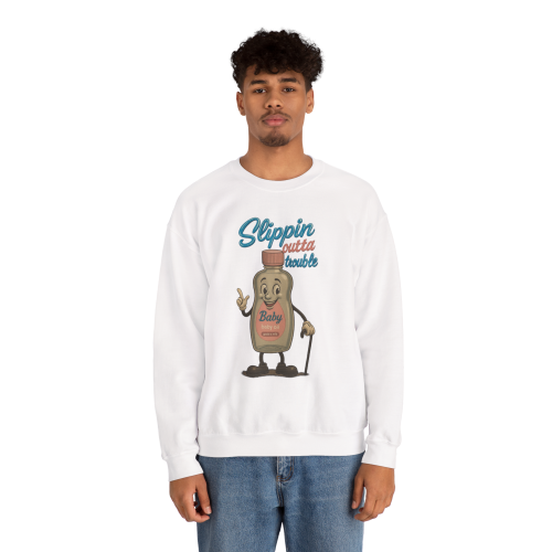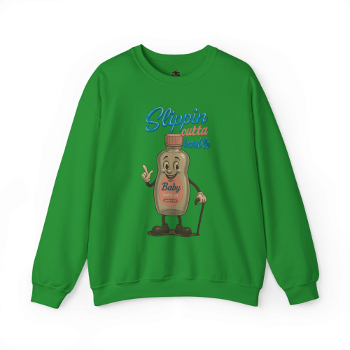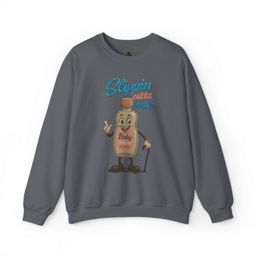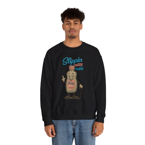 When life gets messy, just slip on this crewneck and glide past the drama. Featuring a retro cartoon baby oil bottle with a cheeky grin and the phrase “Slippin’ Outta Trouble,” this sweatshirt is equal parts nostalgic and hilarious.