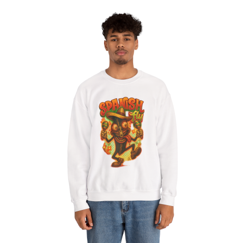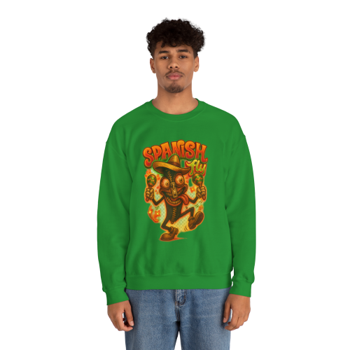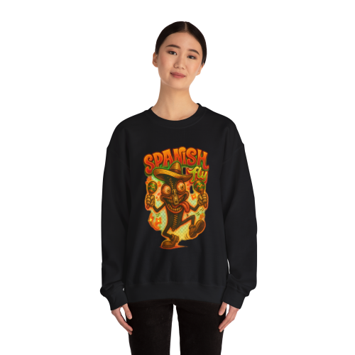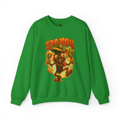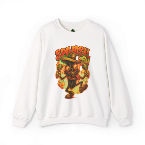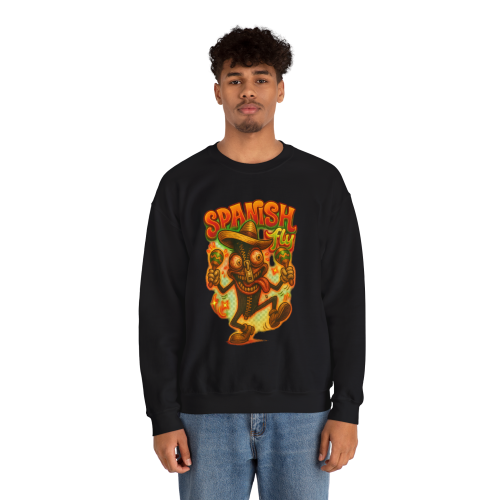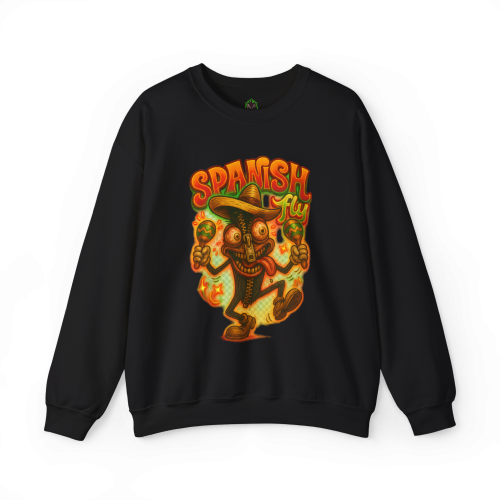 Spanish Fly – Original Edition is pure chaos in cartoon form. This fiery-eyed insect is shaking maracas, rocking a sombrero, and clearly riding the high of ten questionable decisions. Surrounded by flames and pure fiesta madness, this crewneck is a must-have for party animals and late-night legends.