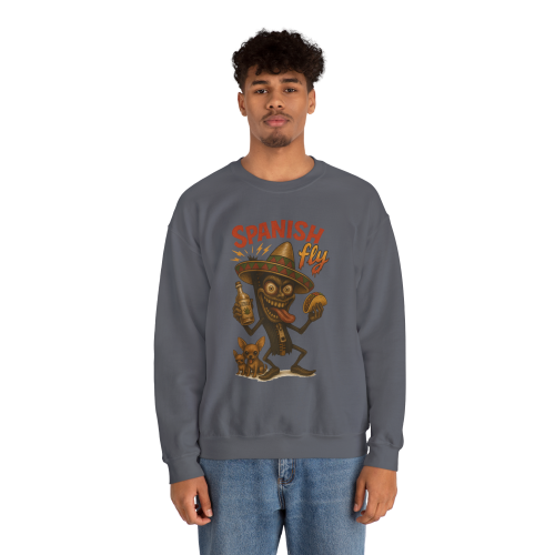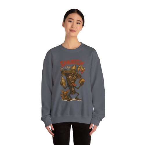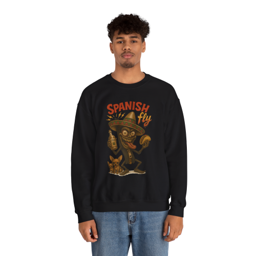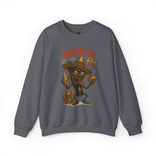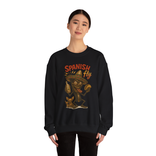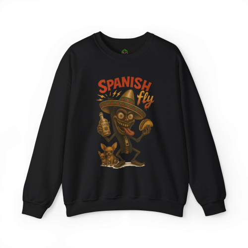 Spanish Fly – Tequila Edition features a chaotic cartoon insect with wild eyes, a bottle of tequila, a taco in hand, and a little dog that’s clearly seen things. This crewneck isn’t just festive—it’s full-on fiesta meltdown.