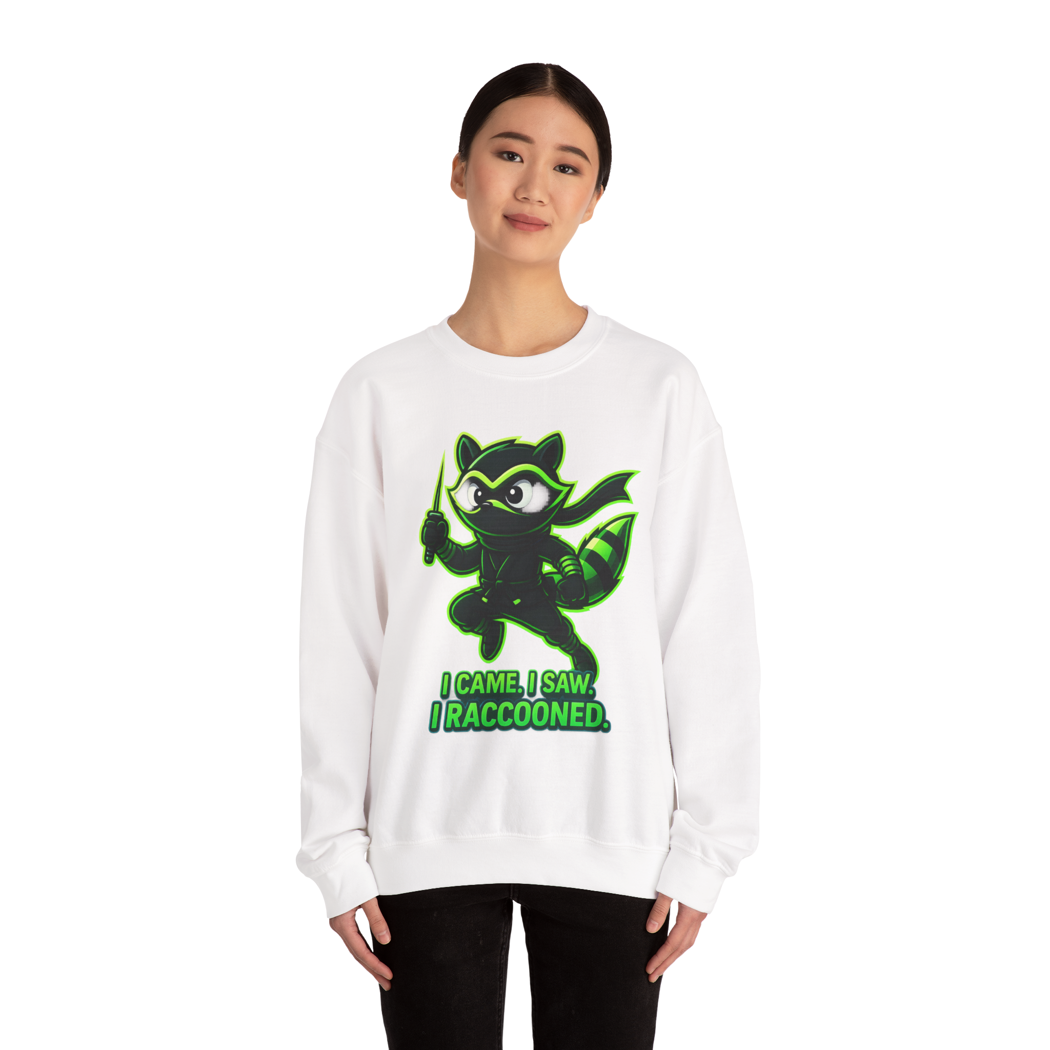 A shadow moves. A trash can tips. You blink, and your snacks are gone. Meet your new favorite bandit: the glowing green ninja raccoon who came, saw, and raccooned. This stealthy warrior’s armed with a blade, a mask, and that trademark raccoon energy—chaotic, resourceful, and ready for action. Whether you're a night prowler or just vibing with sneaky energy, this crewneck brings ninja heat and cartoon mischief in one dope package.
