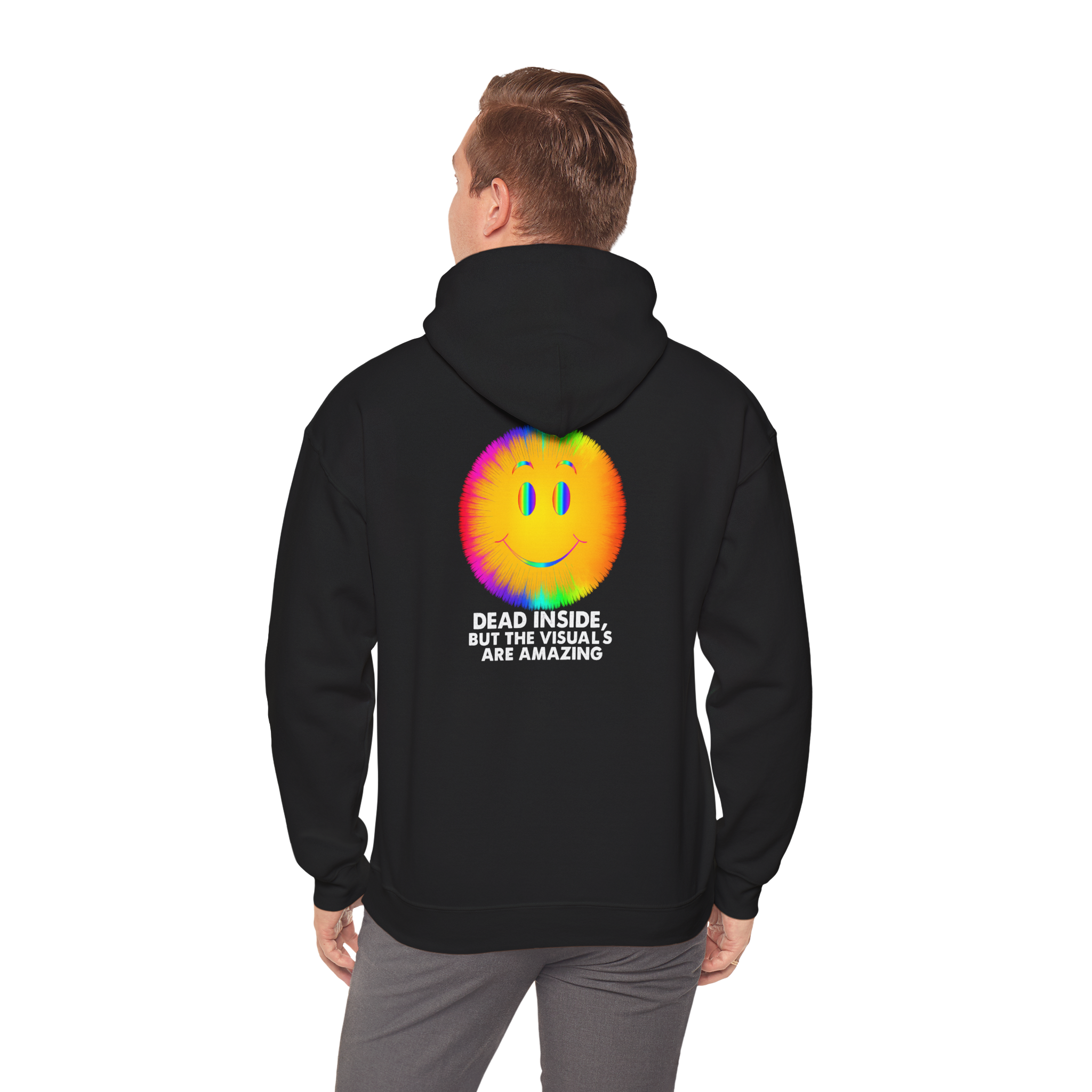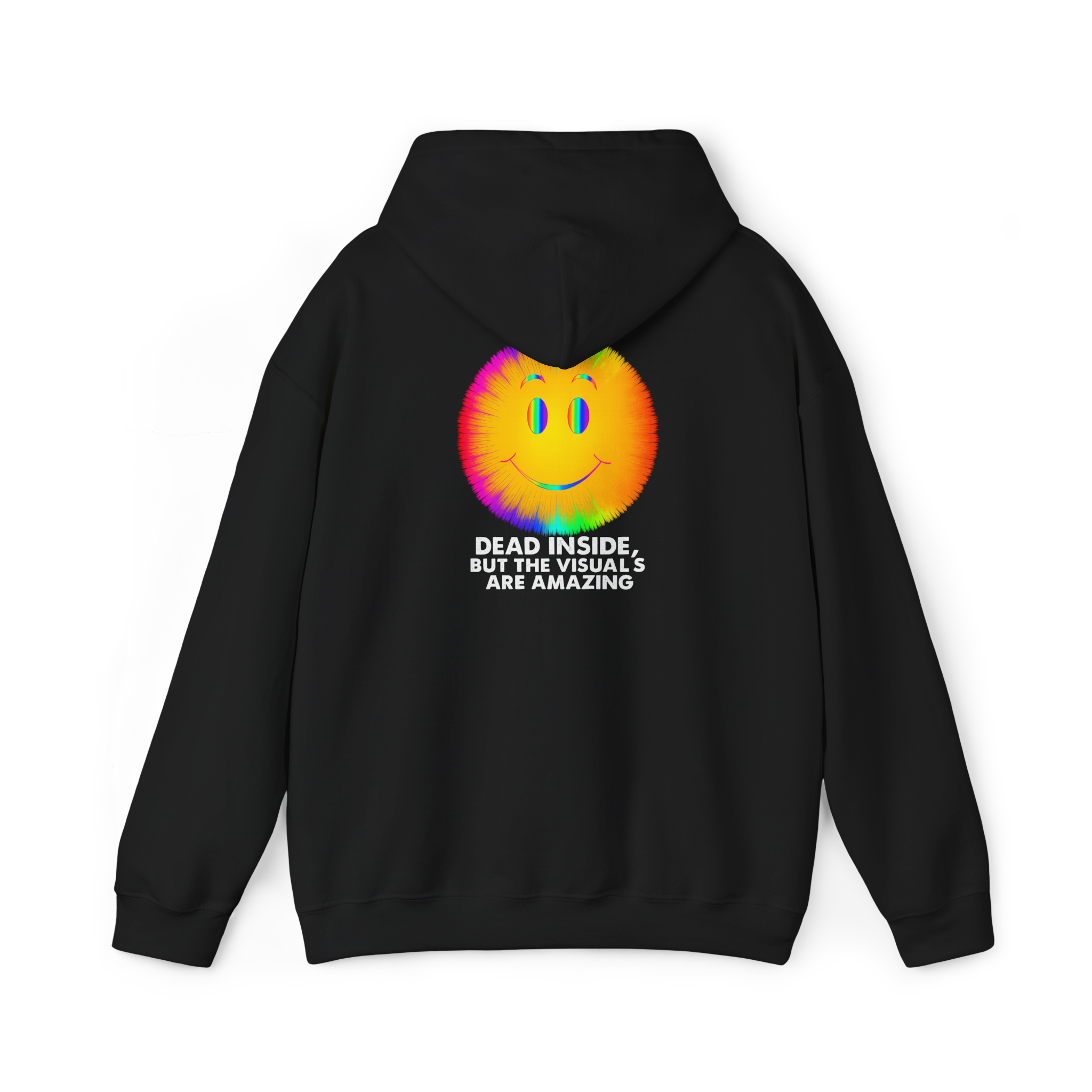 The Dead Inside But the Visuals Are Amazing Hoodie hits right in the neural cortex. With a trippy neon smiley face bursting with glitchy rainbow vibes, this is the go-to piece for overstimulated souls coasting on chaos. A visual sugar rush for the emotionally comatose.