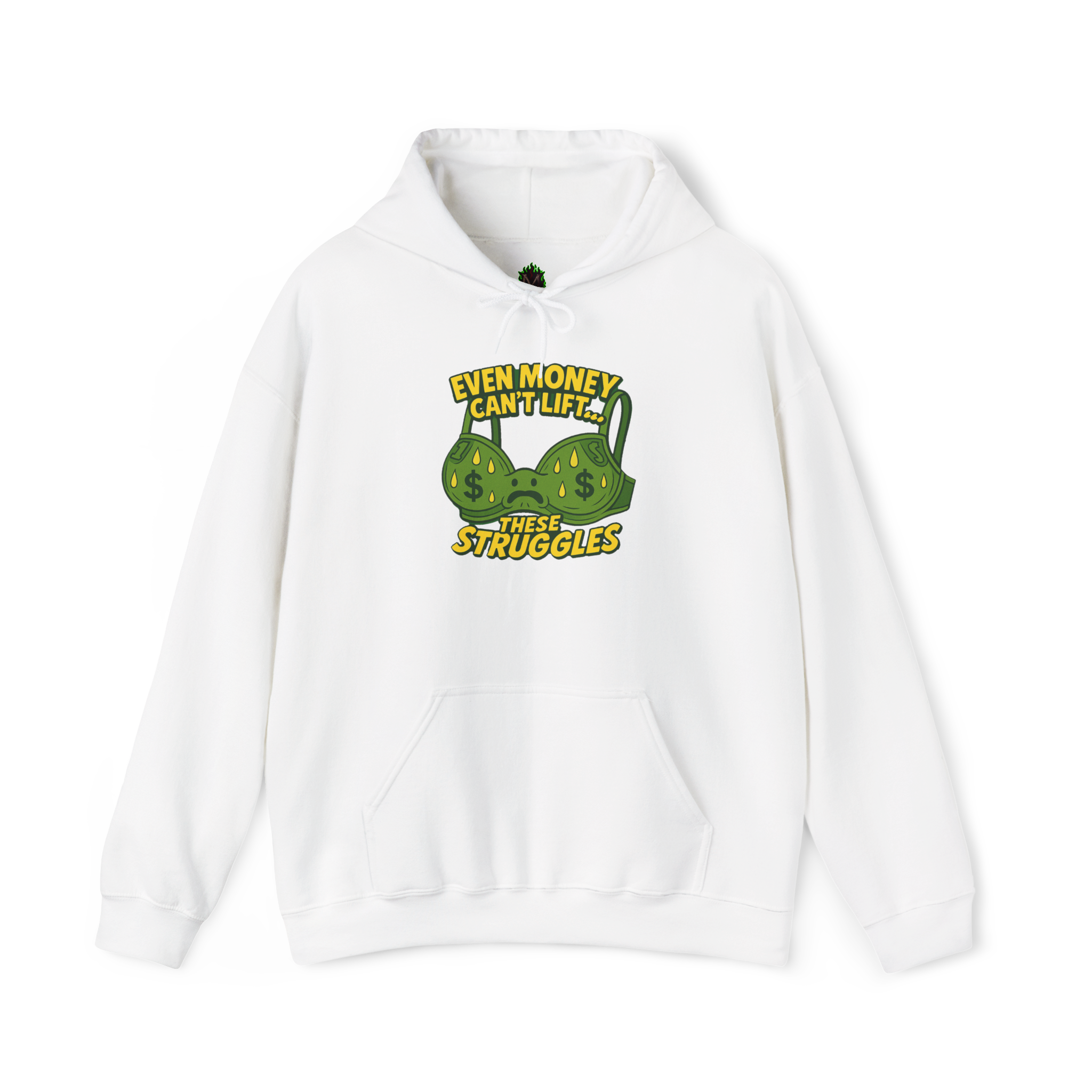 Even money can't lift these struggles—and neither can this cartoon cash bra. This hoodie delivers the kind of brutal honesty we all need, with a splash of humor and a punch of personality.