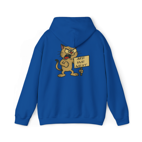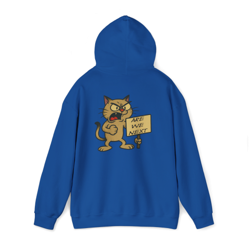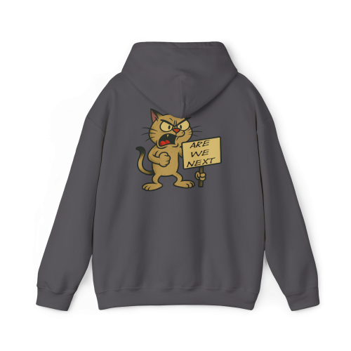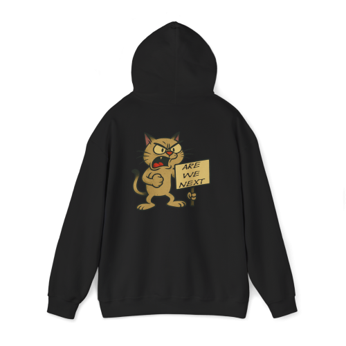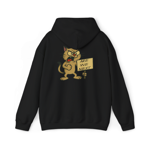 Are We Next?—a hoodie that asks the big question through the angry eyes of a fed-up cartoon cat. Whether it’s a protest, a movement, or a meltdown, this cat is all in. And yes, it bites.