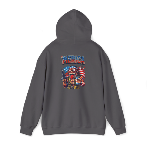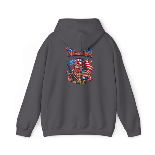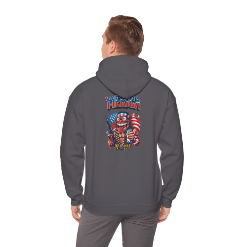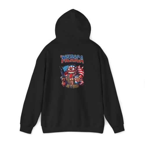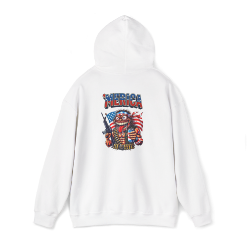 'MERICA – where your monster is wrapped in a flag, armed to the teeth, and drinking beer with a crazed grin. This hoodie turns your loudest instincts into wearable anarchy.