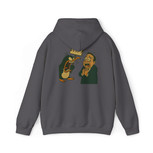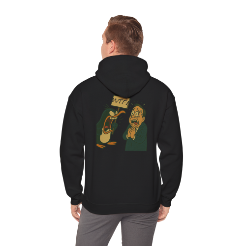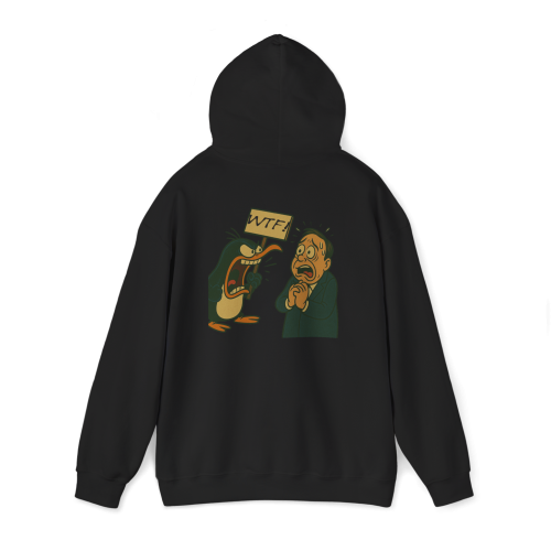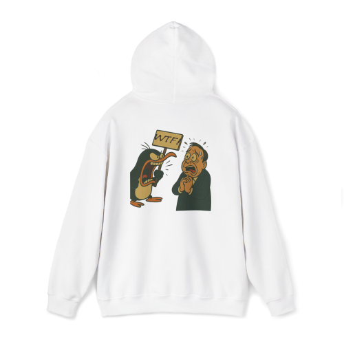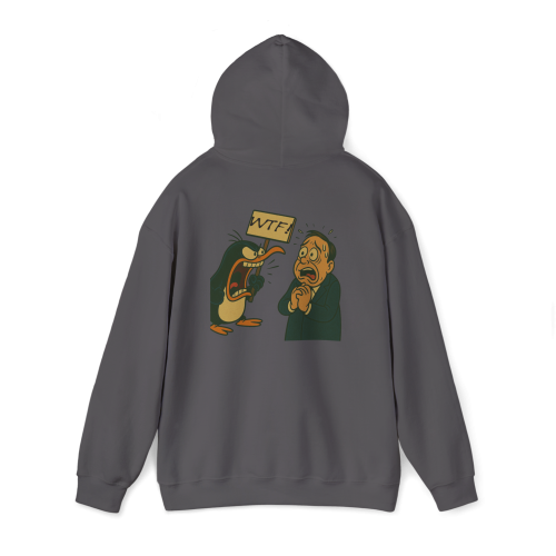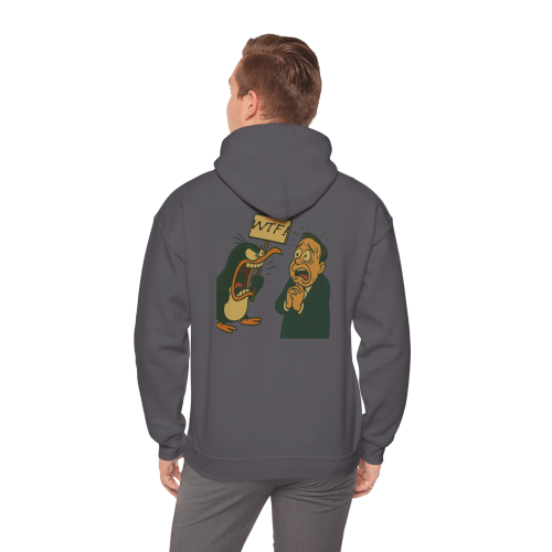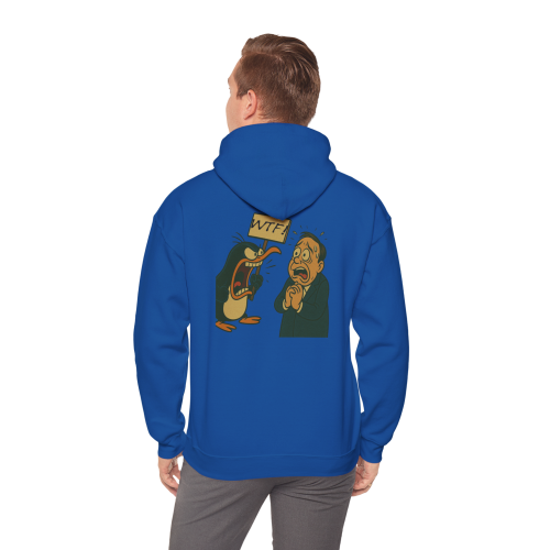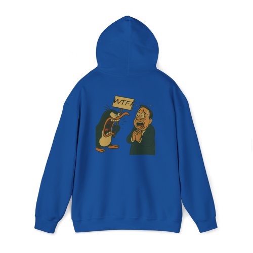 WTF Penguin Rage brings chaotic energy to your wardrobe. Featuring a screaming cartoon penguin holding a “WTF” sign while confronting a terrified man, this back-print design captures the exact moment before you snap… but in a funny way.