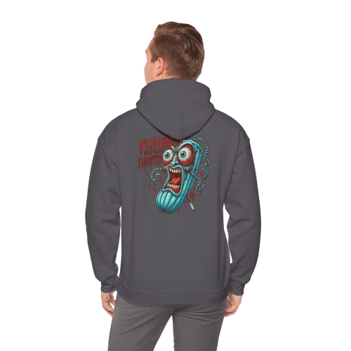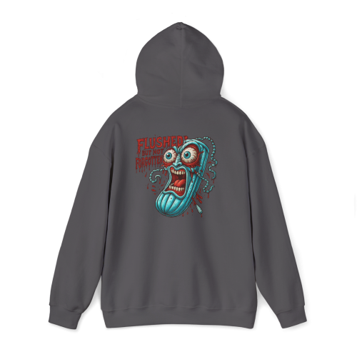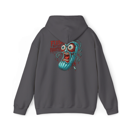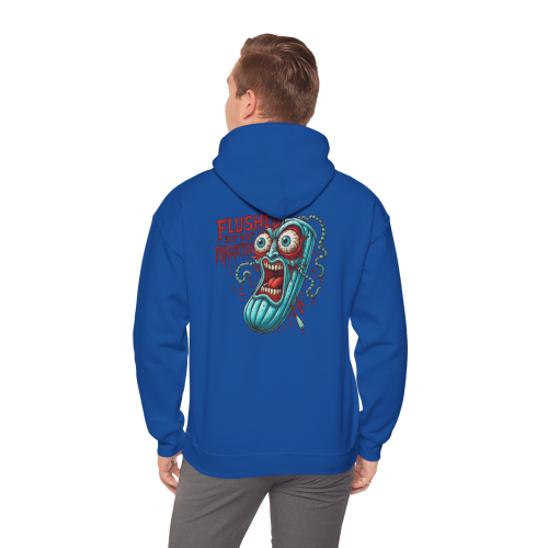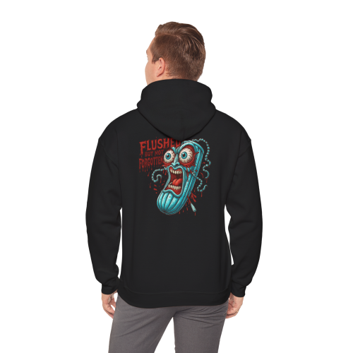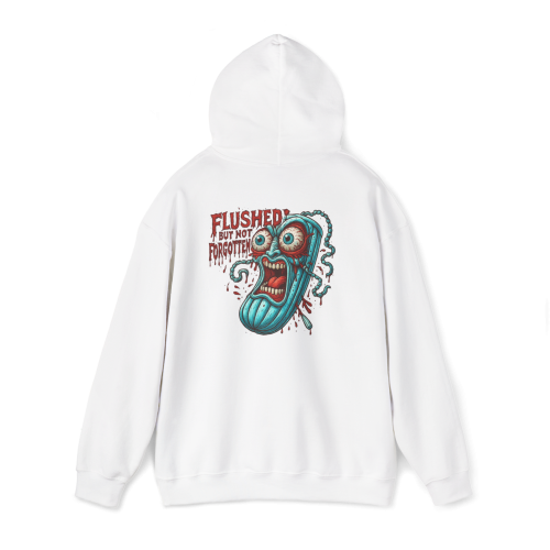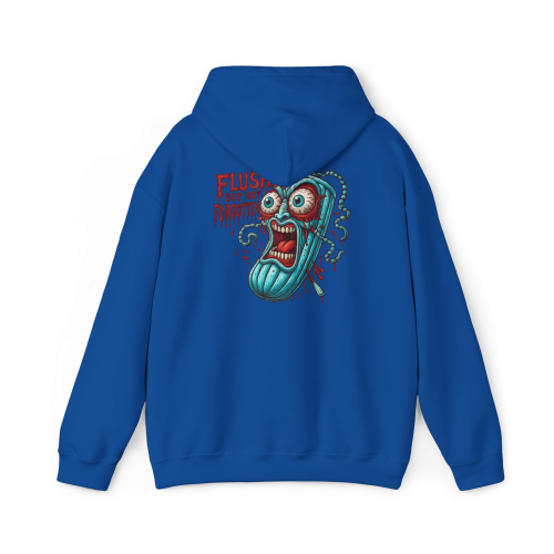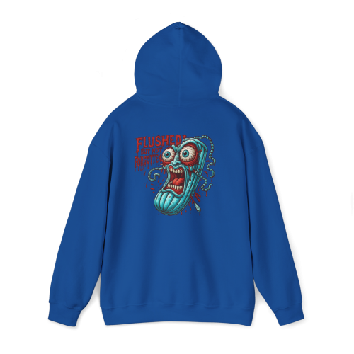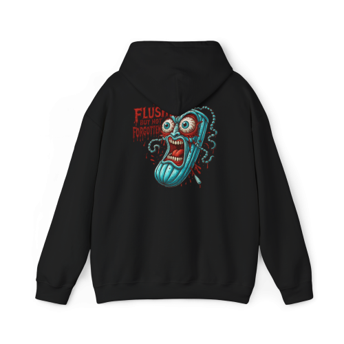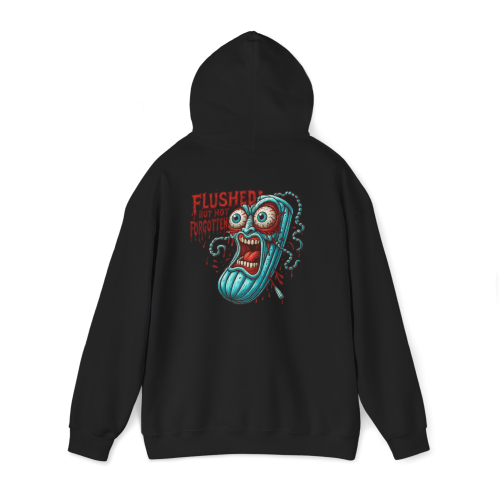 This hoodie blends grotesque art with twisted comedy, turning a sanitary pad into a blood-soaked nightmare cartoon. With bugged-out eyes, a manic grin, and the unforgettable phrase “Flushed But Not Forgotten,” this design is both disturbing and hilarious.