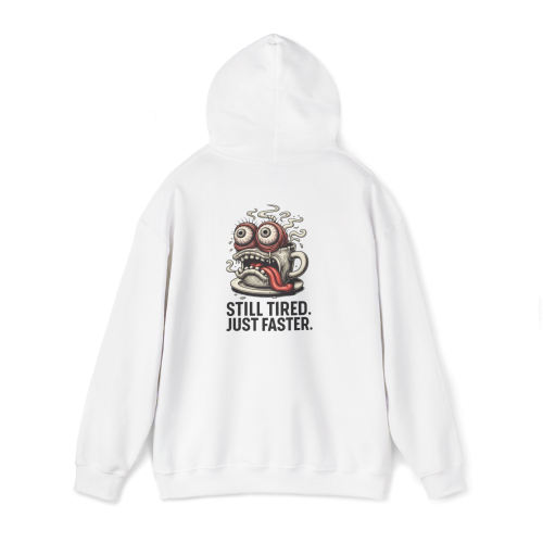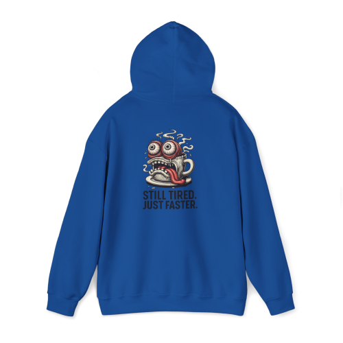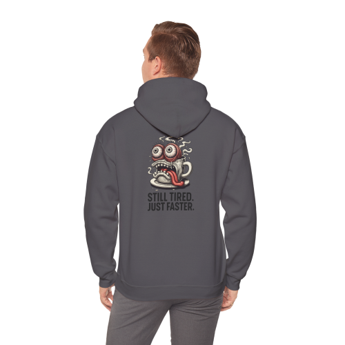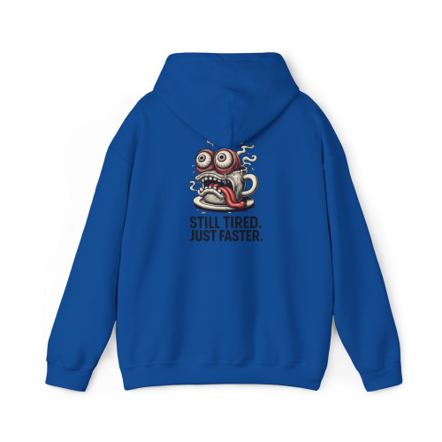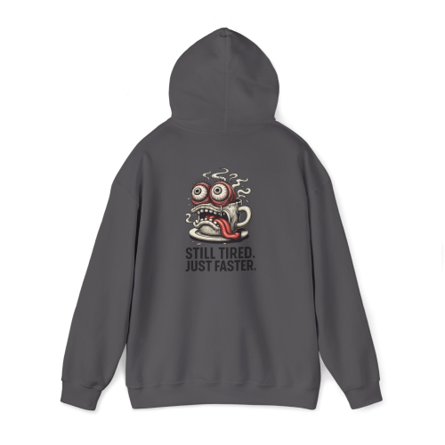 The Still Tired, Just Faster hoodie showcases a deranged coffee mug with twitchy, bloodshot eyes, a tongue hanging out like it?s done with life, and steam that screams ?Help me.?