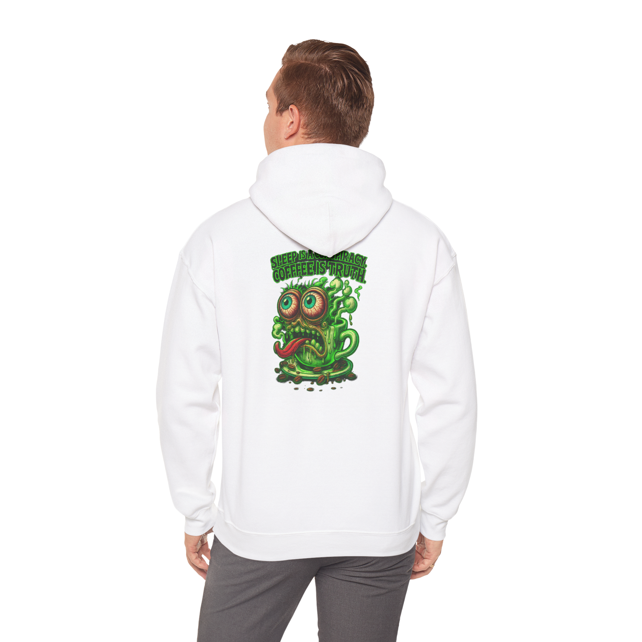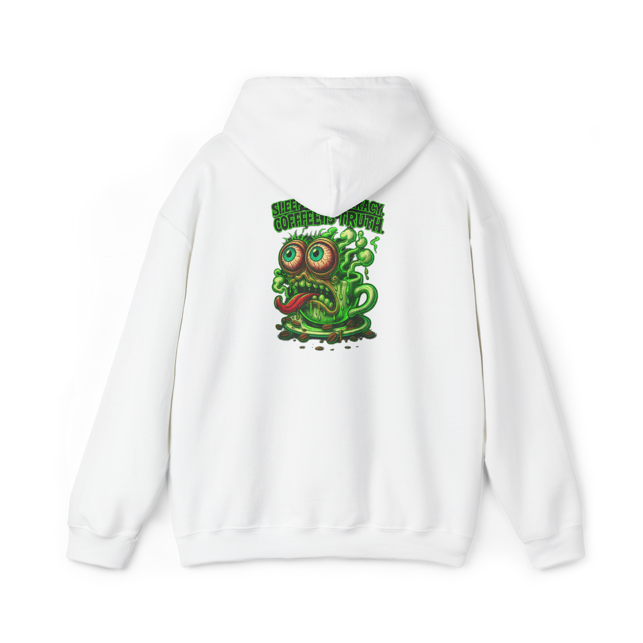 This hoodie puts your jittery truth front and center. With a deranged green coffee mug oozing madness and espresso-fueled wisdom, it's a walking manifesto for those who run on anxiety and cold brew. Forget rest?there?s caffeine to be worshipped.