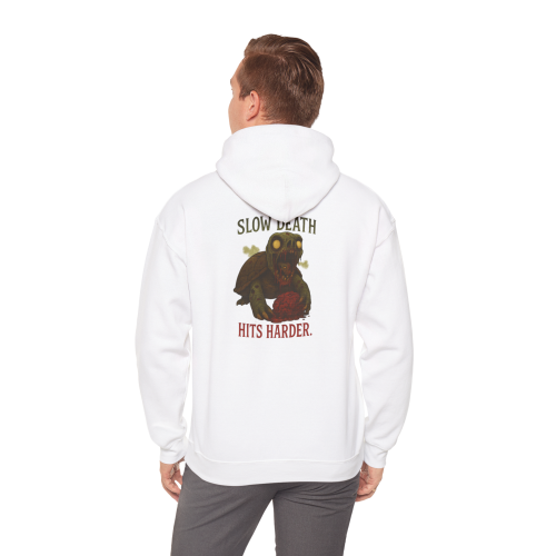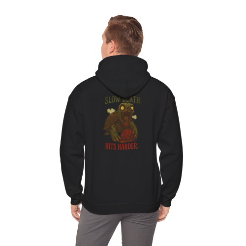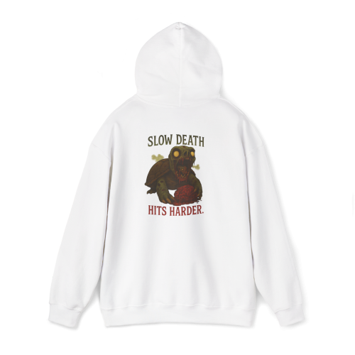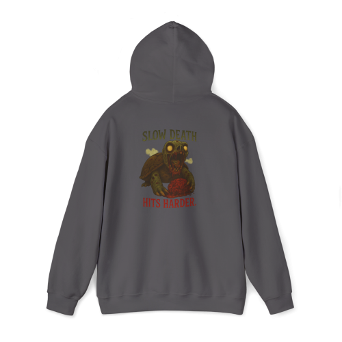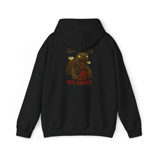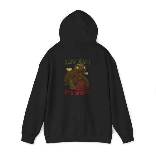 This isn’t your average turtle. With glowing eyes, rotting flesh, and a bloody heart in its grasp, this design speaks for the slow, steady horror that creeps up—and consumes. For fans of dark humor, zombies, and metaphorical heartache, this hoodie bites hard… eventually.