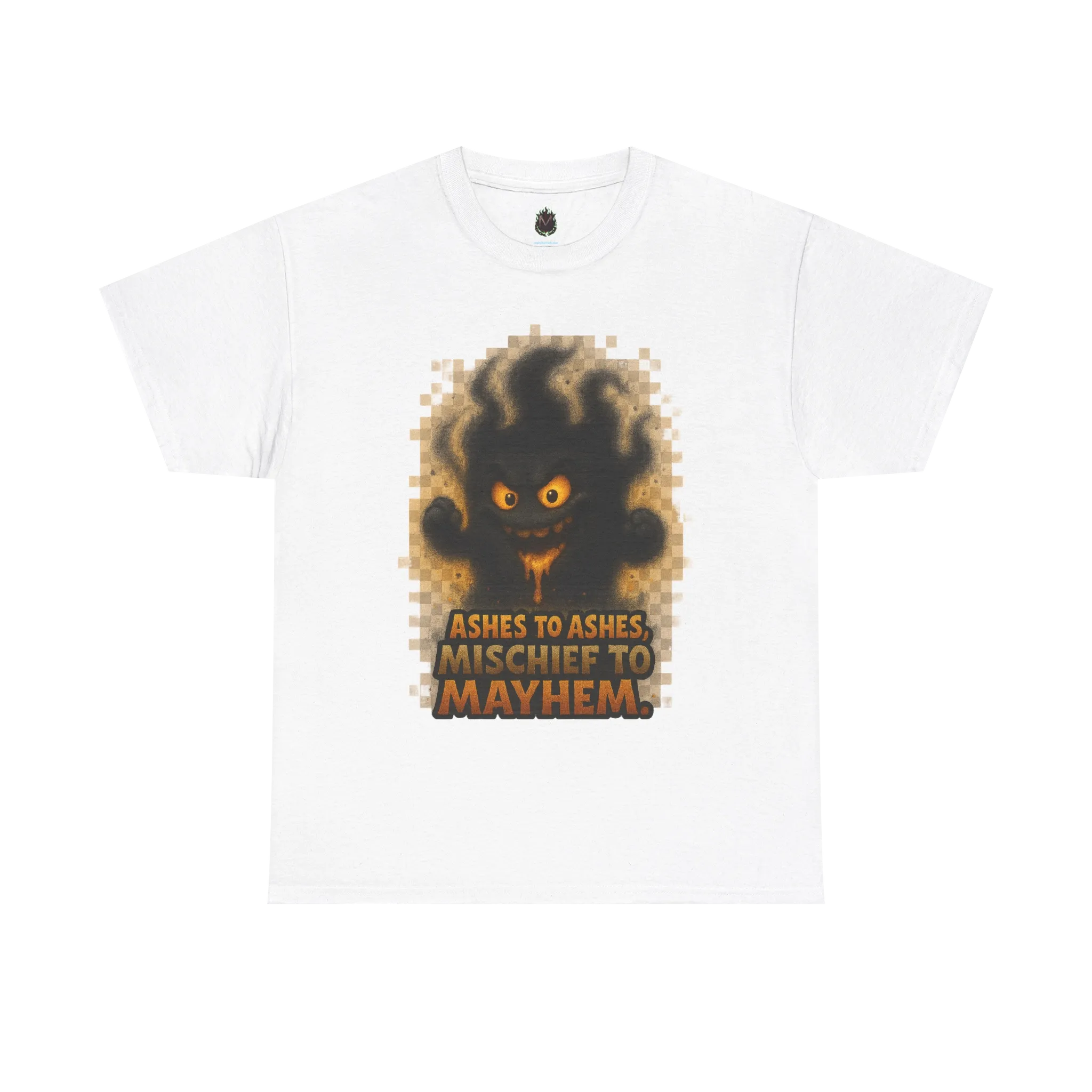 Featuring a pixel-frayed chaos creature emerging from the void alongside the phrase “Ashes to Ashes, Mischief to Mayhem”, this design blends dark humor with glitchy menace.