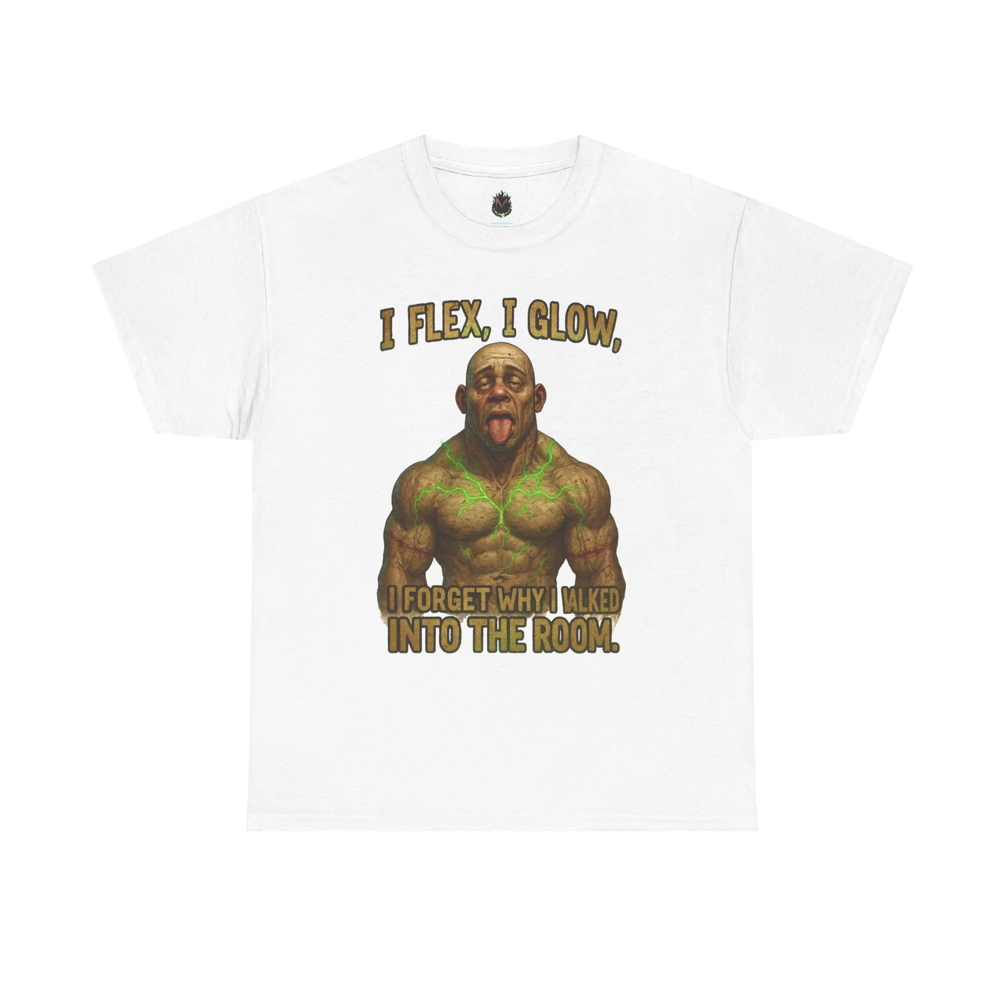 Featuring a massively built character radiating chaotic energy paired with the phrase “I Flex, I Glow, I Forget Why I Walked Into the Room,” this shirt celebrates strength, distraction, and misplaced priorities.