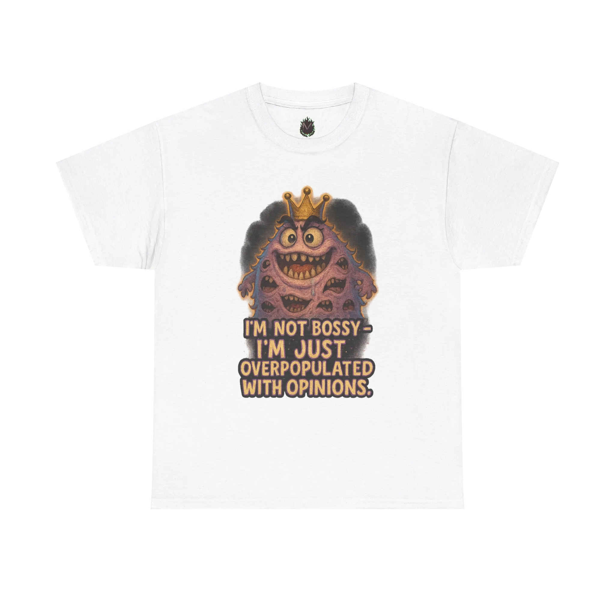 This design features a crowned, many-faced creature paired with the phrase “I’m Not Bossy — I’m Just Overpopulated With Opinions.” It’s a visual representation of having too many thoughts, too many voices, and absolutely no intention of keeping them quiet.