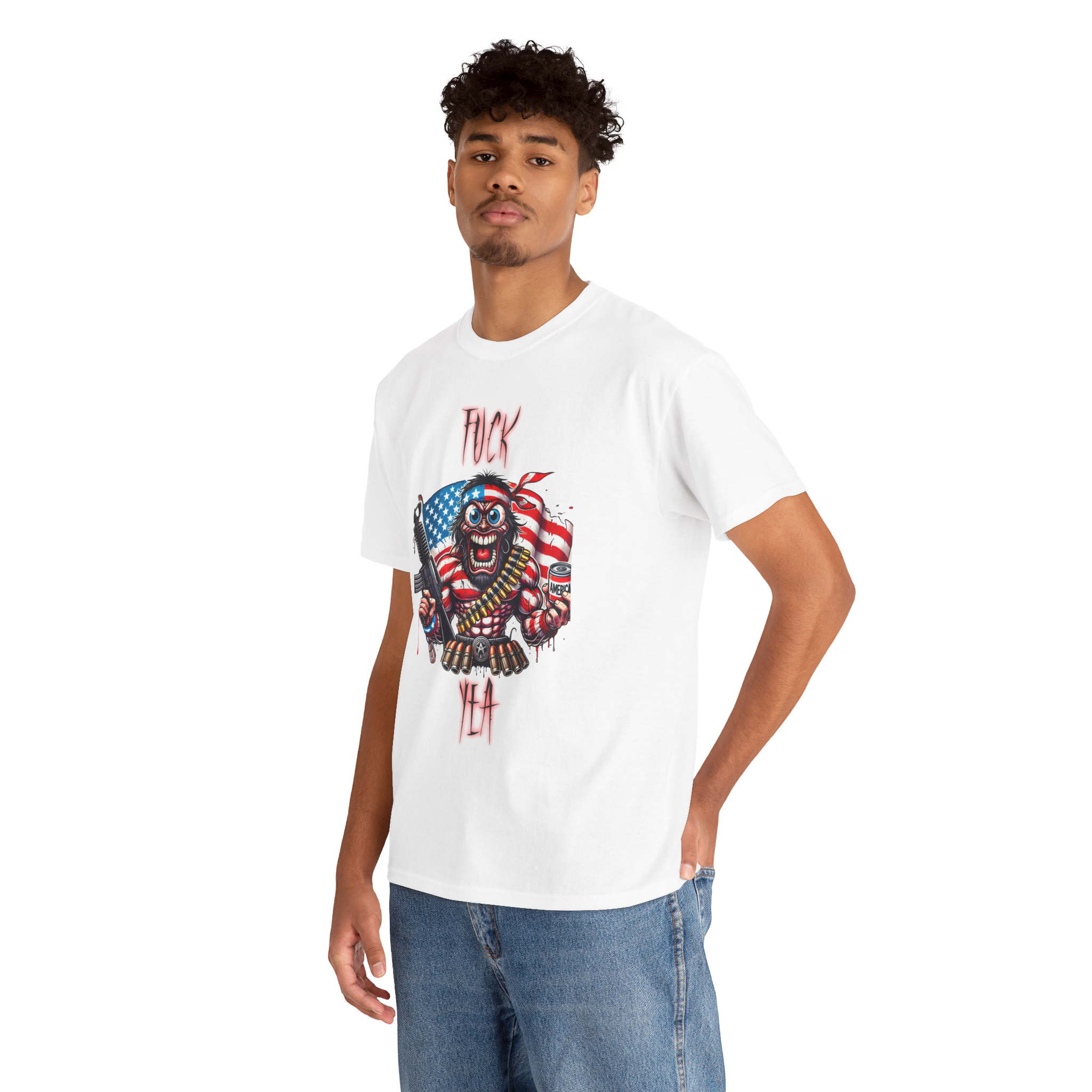 This shirt goes full throttle on patriotism and doesn't ask for permission. Featuring a wild-eyed musclehead decked out in stars, stripes, and brass knuckles of liberty, it’s the chaotic good energy your wardrobe never knew it needed.