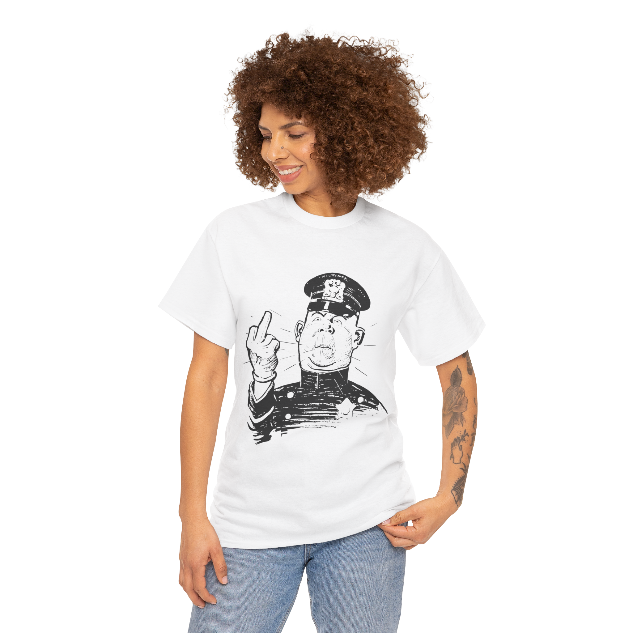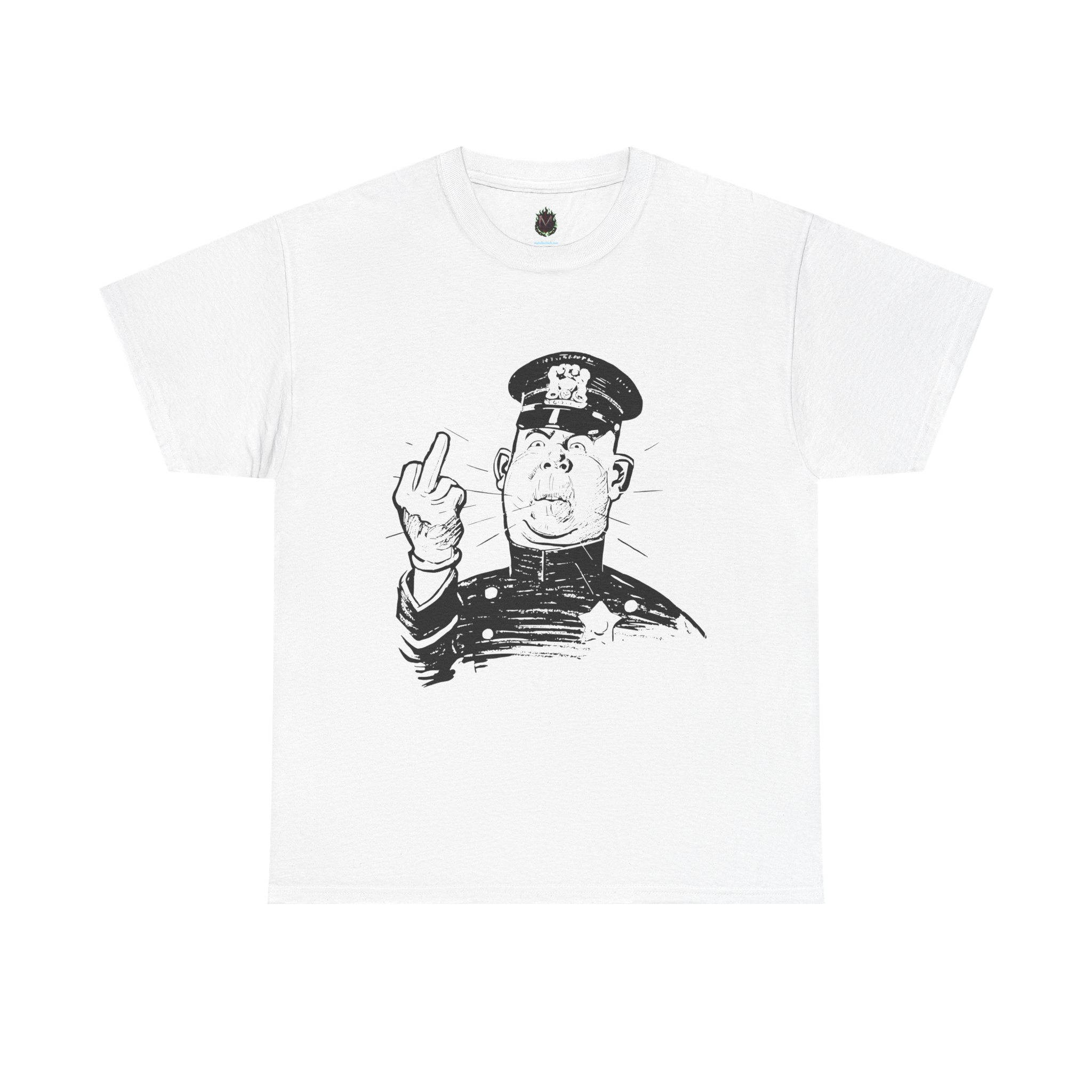 A bold, rebellious tee featuring a cartoon cop flipping the bird — not for the faint of heart.