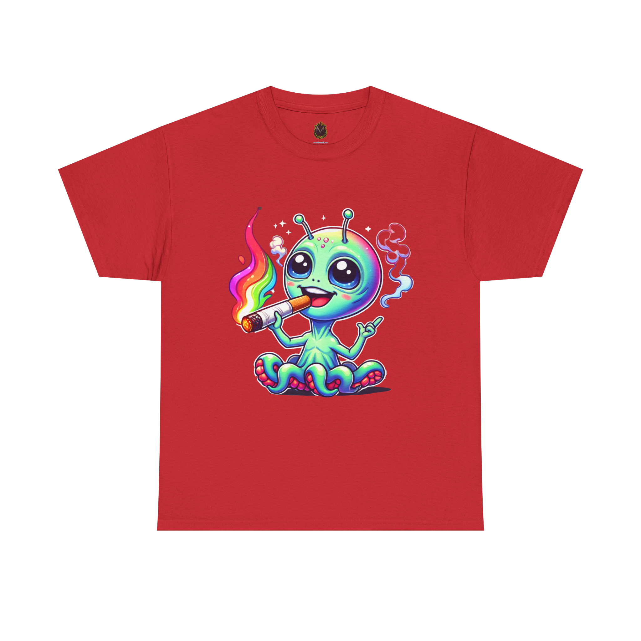 This shirt features the galaxy’s chillest alien getting lit with a fat, rainbow-sparking joint. With eyes full of wonder and smoke curling like stardust, this little guy is proof that space isn’t the final frontier — it’s just the beginning of the trip.