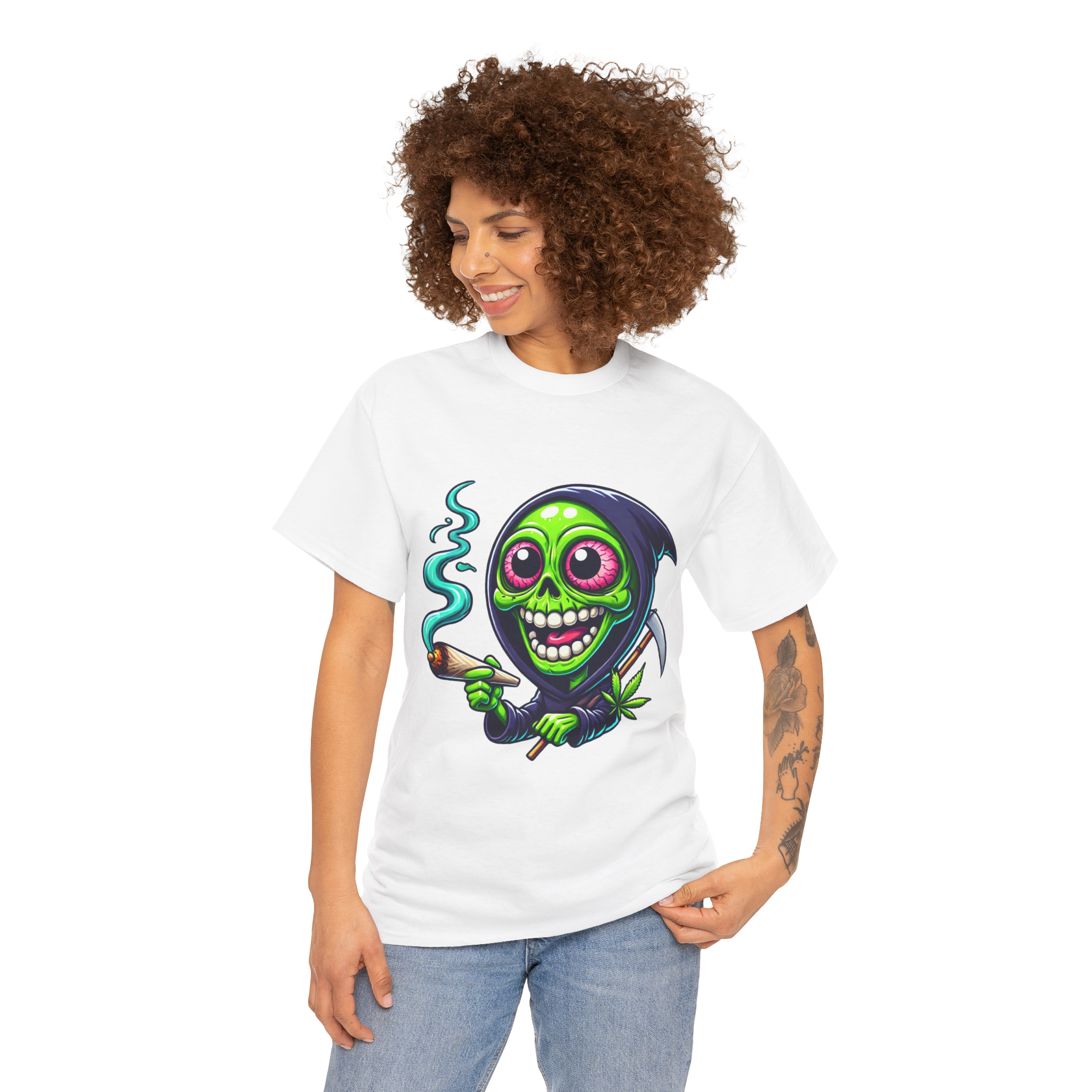 Meet the happiest grim reaper you’ve ever seen — wide-eyed, baked out of his skull, and puffing on a joint like he’s got all eternity to relax. With his trusty scythe slung across his back and a big goofy smile, this high little harvester of souls is ready to spread peace, not panic.
