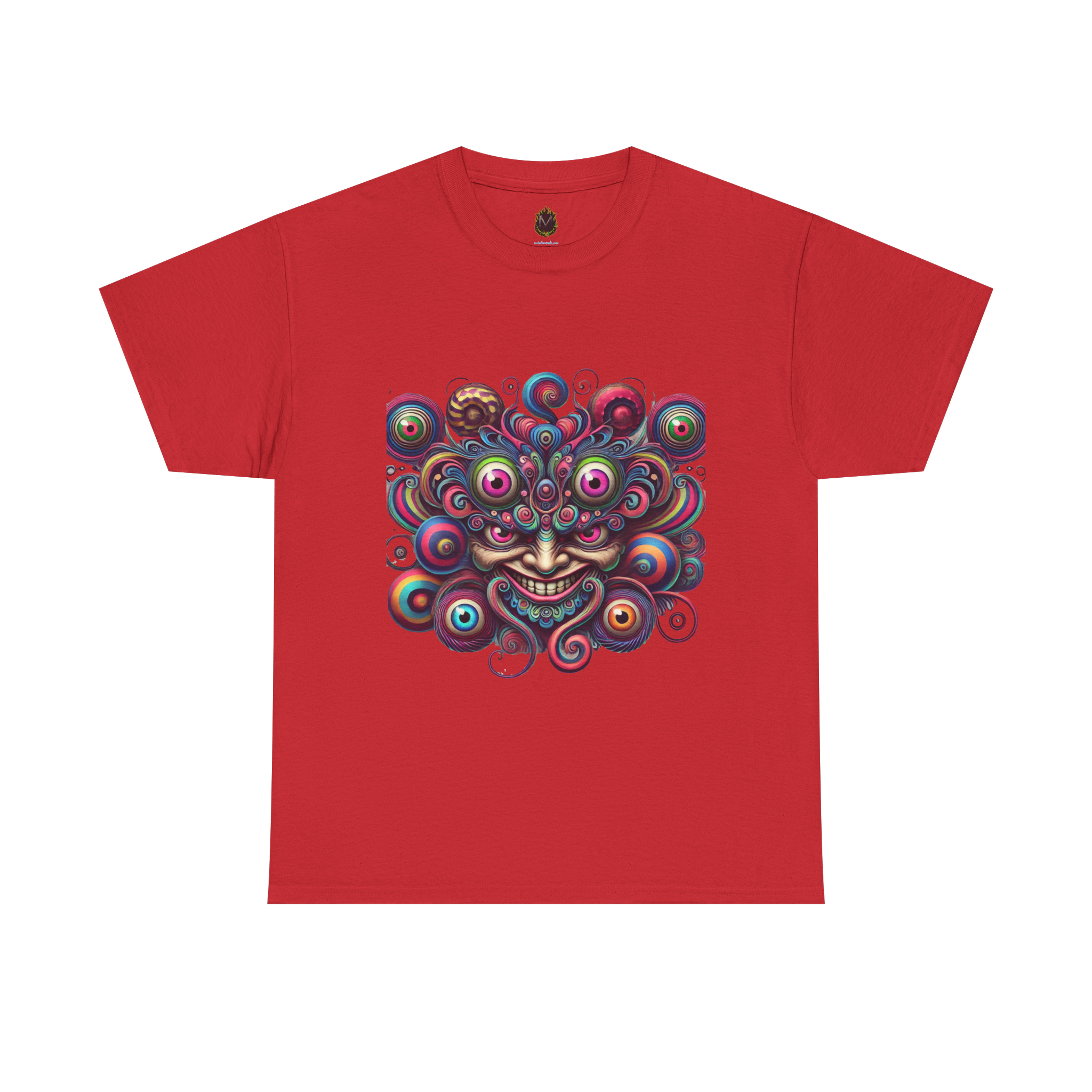 This shirt is pure visual madness — a psychedelic face made of swirling patterns, colorful eyes, and an unsettling grin that feels like it's watching you from every angle. It’s part monster, part hallucination, and all kinds of weird. Perfect for those who like their art intense, layered, and just a little possessed.