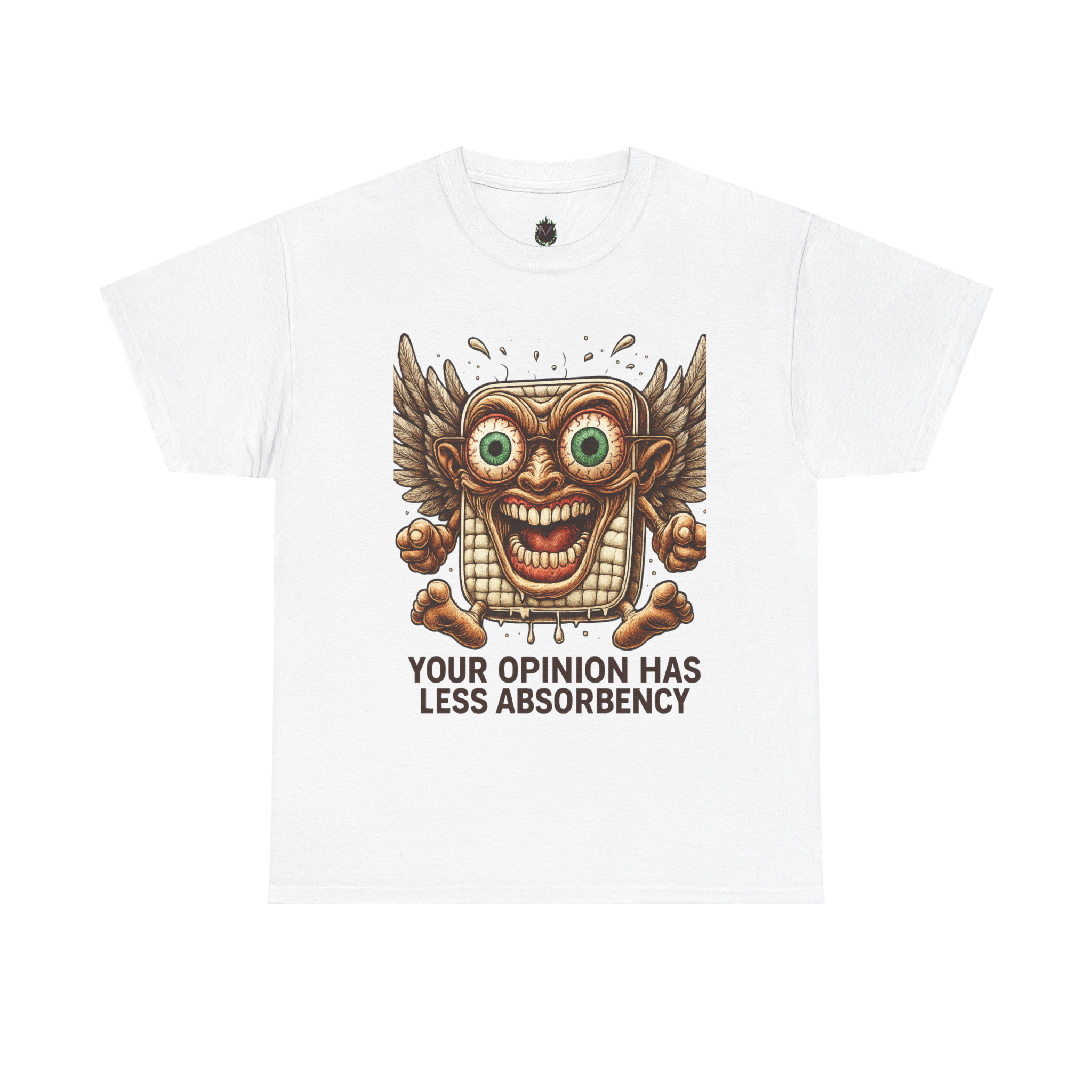 A wide-eyed, winged sanitary pad with the audacity to smile—and the sass to shut down weak opinions.
