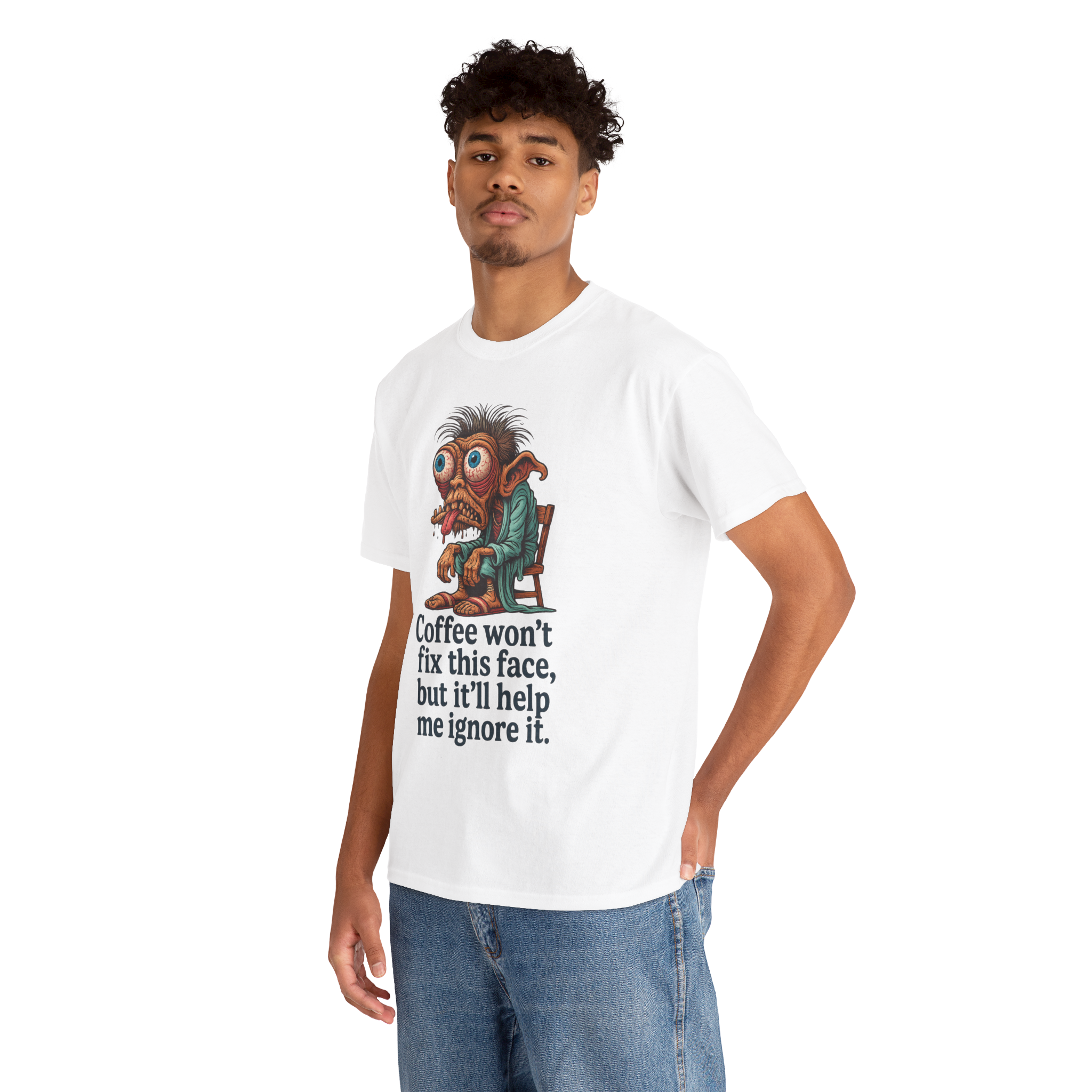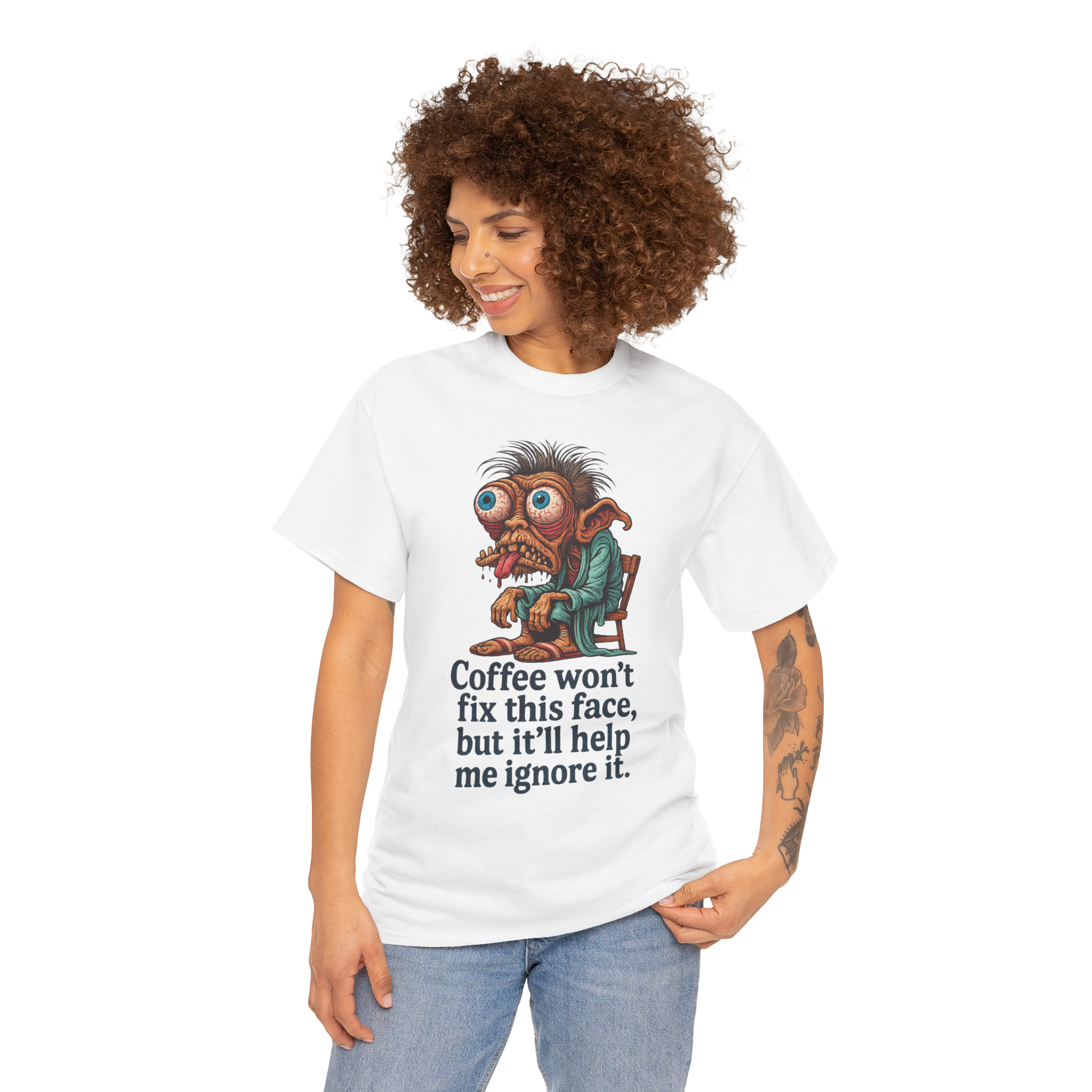 This tee features a disheveled, bug-eyed creature that’s clearly seen better mornings, paired with the brutally honest line: “Coffee won’t fix this face, but it’ll help me ignore it.”