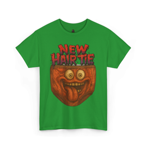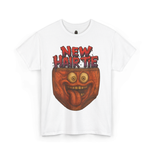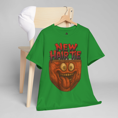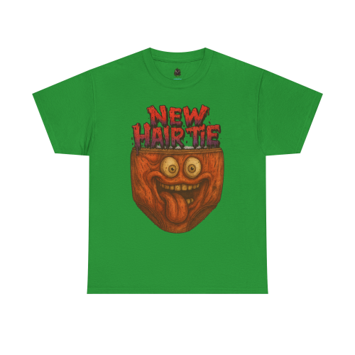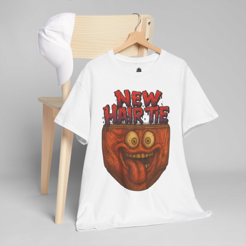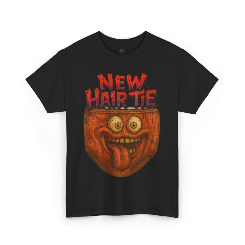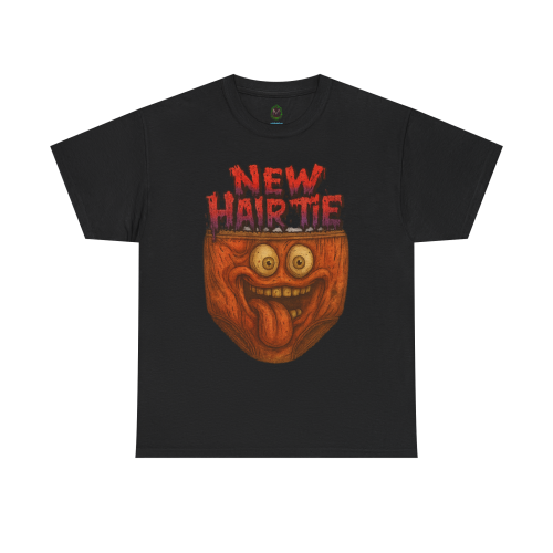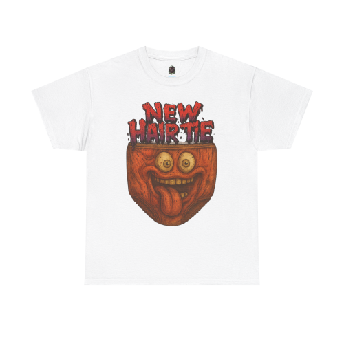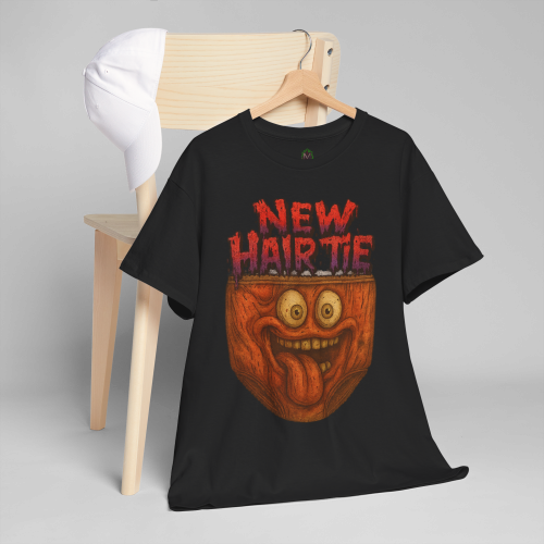 The “New Hair Tie” message is written in dripping red lettering for a horror-comedy vibe. It’s bold, dumb, chaotic—and completely unforgettable.