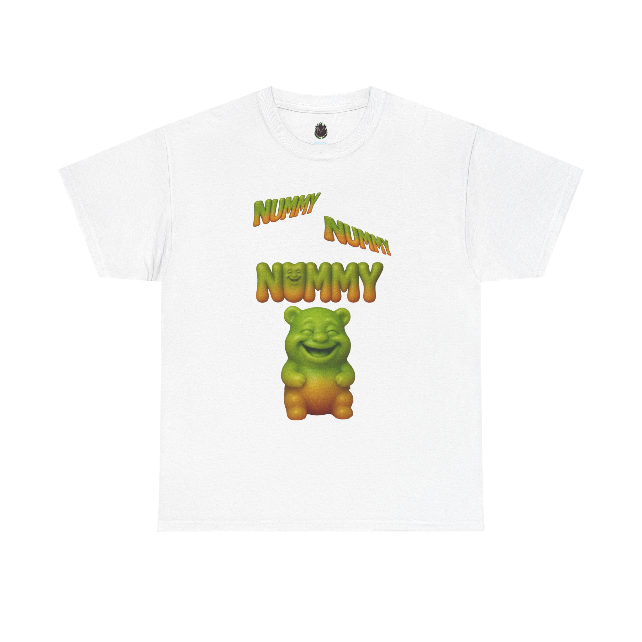 Dripping with chill and glazed in goofy joy, this gummy bear tee brings the perfect hit of weird to your wardrobe. Say it loud: NUMMY NUMMY NUMMY.