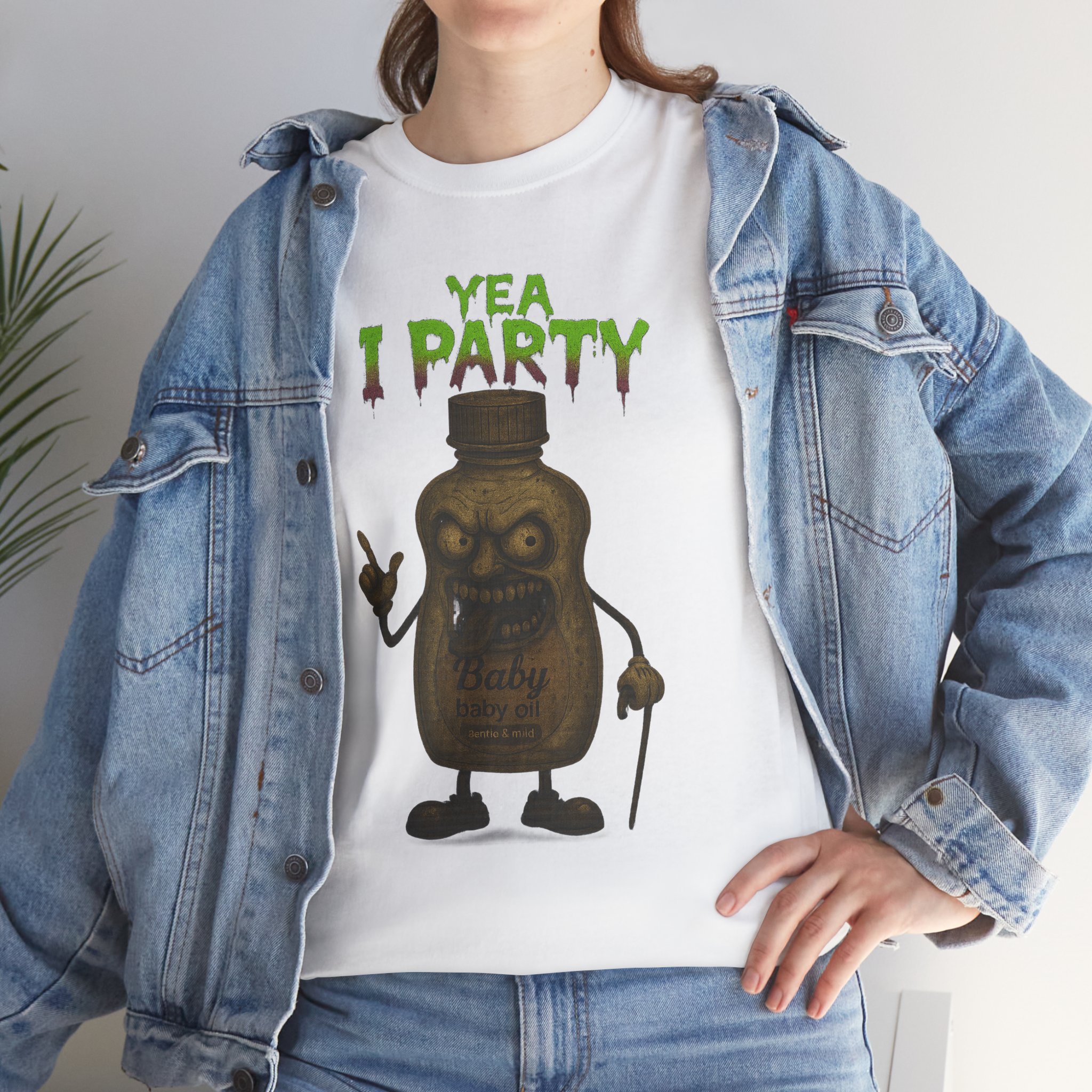 Our “Yea I Party” t-shirt blends horror, humor, and madness in one delightfully disturbing cartoon. From the neon slime font to the insane grin, this shirt is made to terrify, entertain, and confuse – all at once.