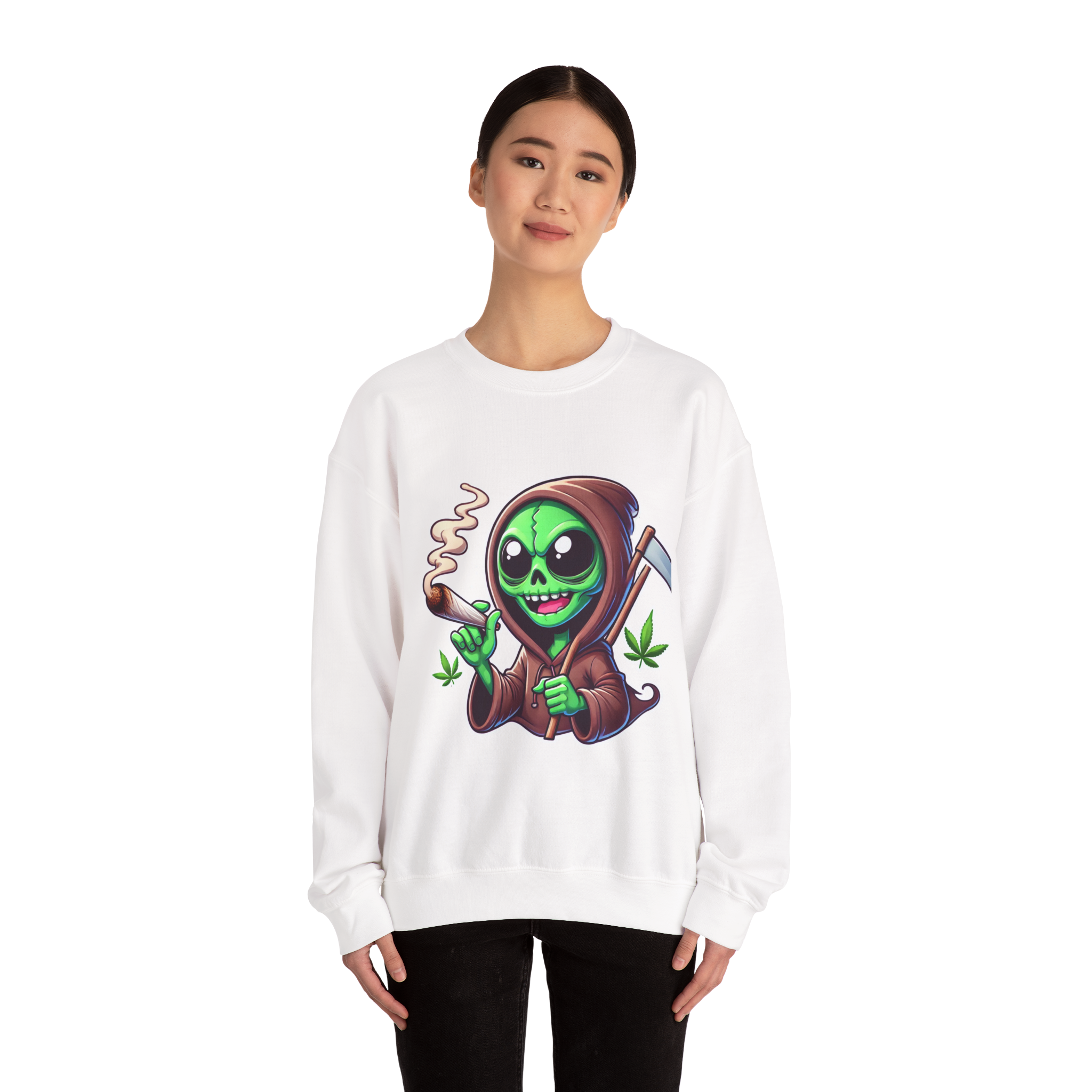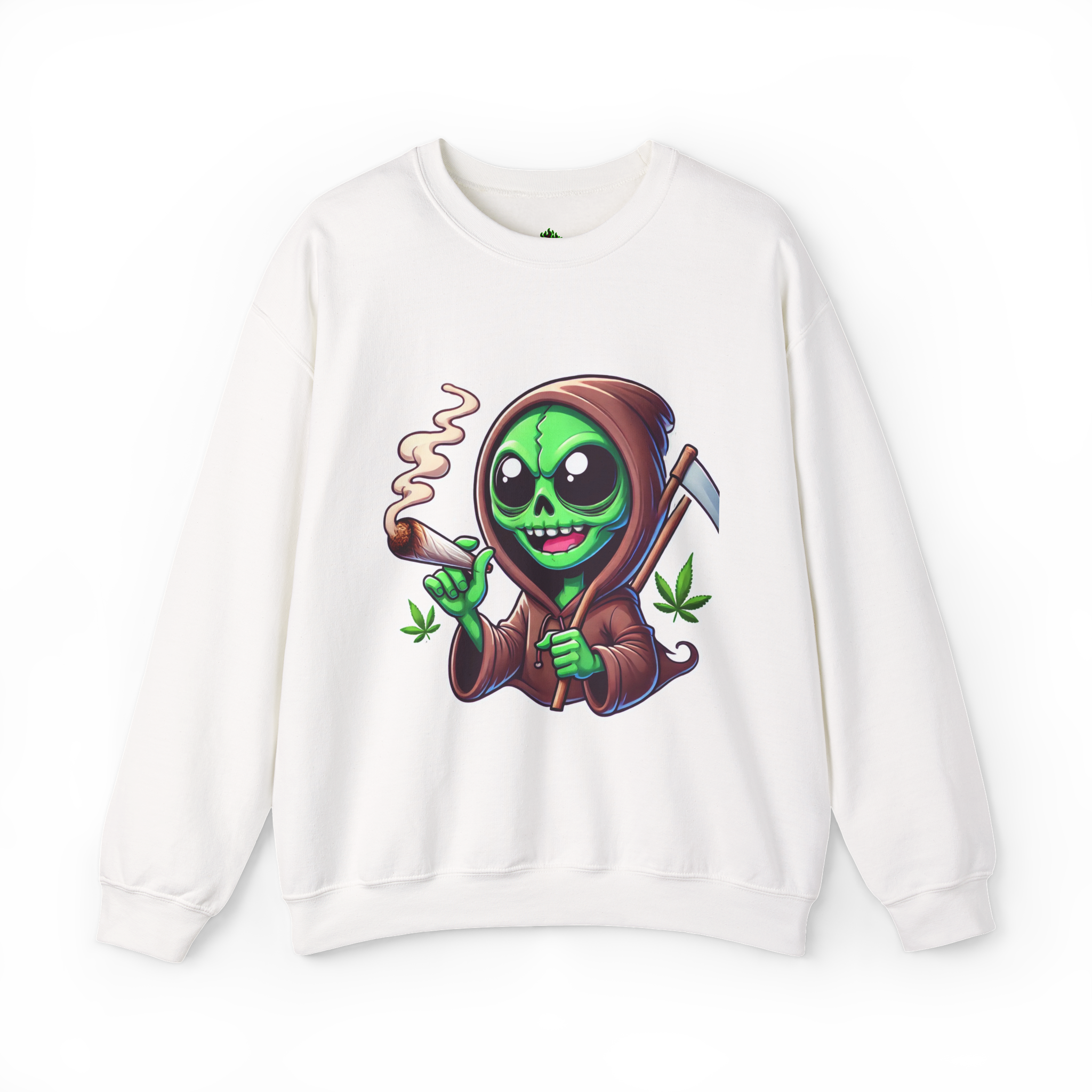 This otherworldly grim reaper blends extraterrestrial charm with interstellar chill, rocking a classic reaper’s robe, a sly smile, and a freshly lit joint. Cannabis leaves float around for an extra dose of green goodness.