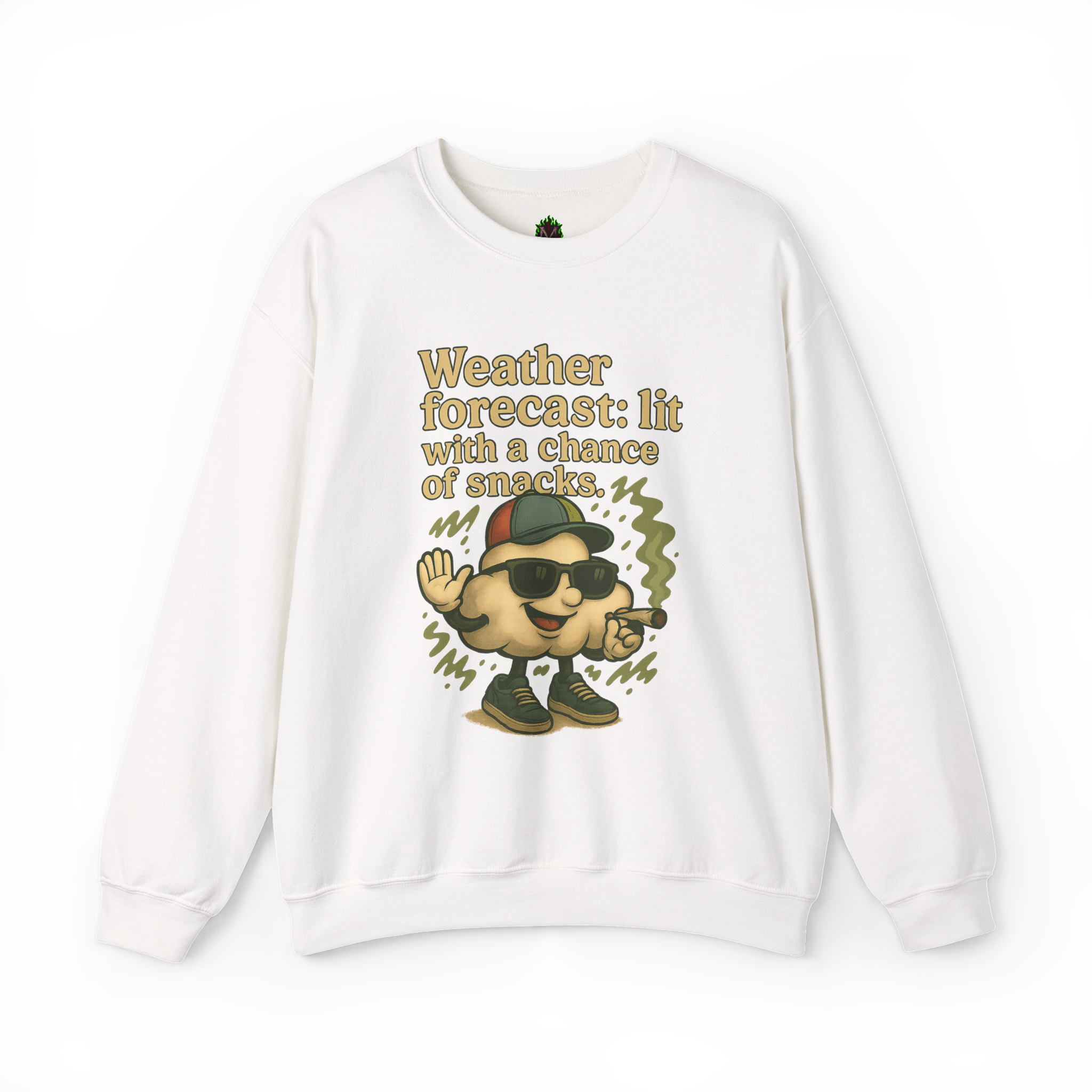 When the vibes are high and the cravings are real, this sweatshirt says it all. Featuring a baked cartoon cloud character in full stoner glory—complete with sunglasses, hat, and joint—this design delivers serious laughs and chill energy. Whether you're sparking up or just love weather puns, this one’s your new go-to.