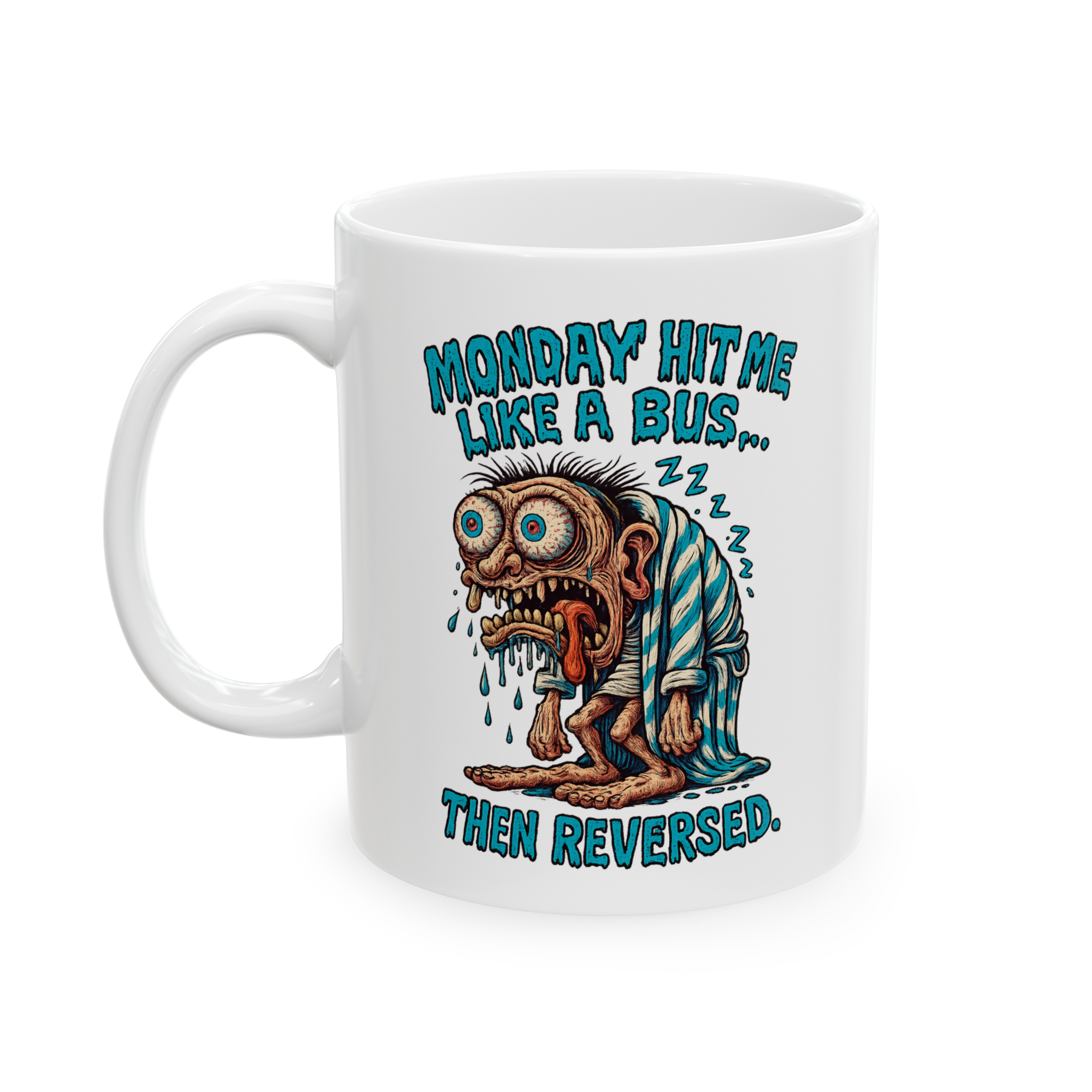 Add the quote “Monday hit me like a bus… then reversed.” and you’ve got the only mug that truly understands.