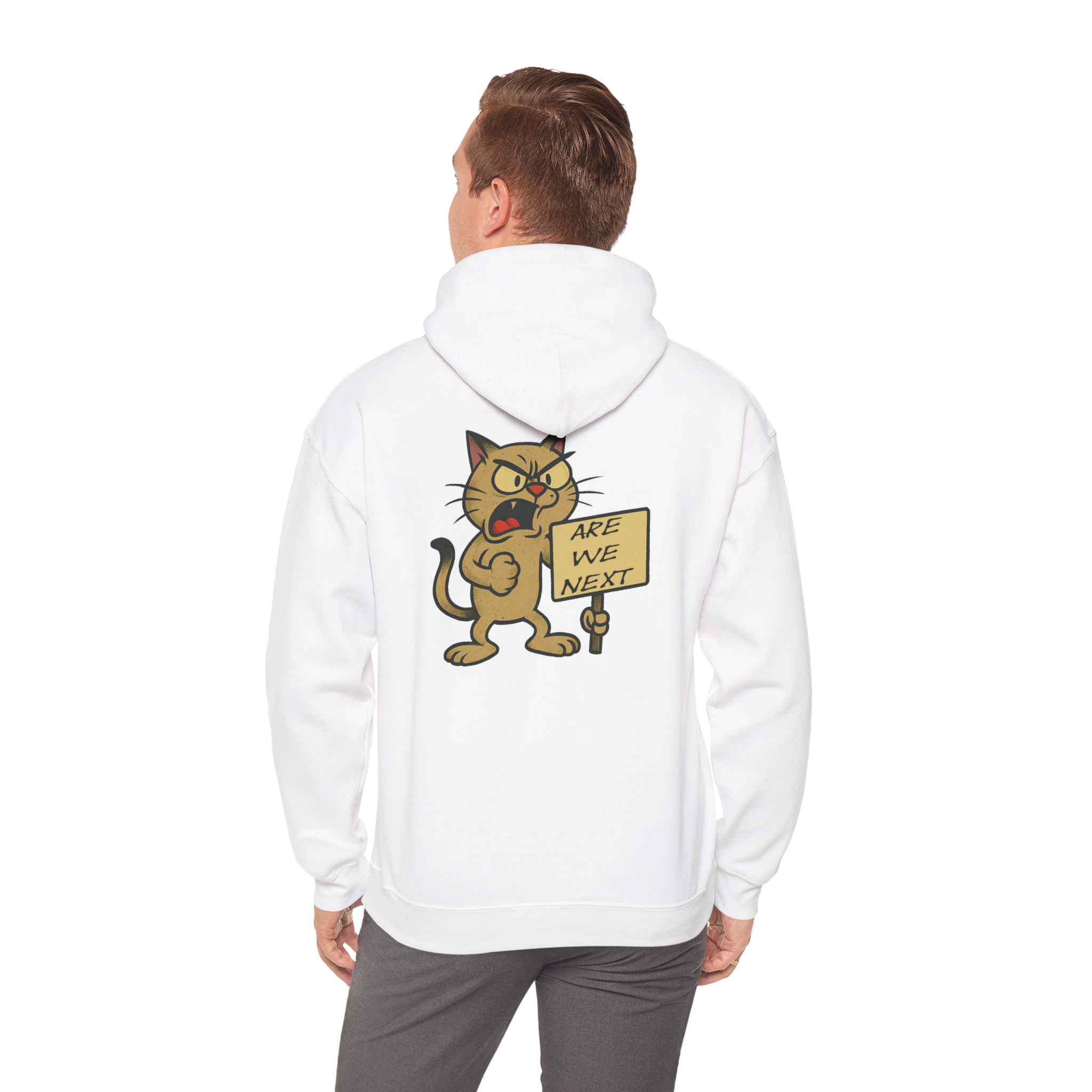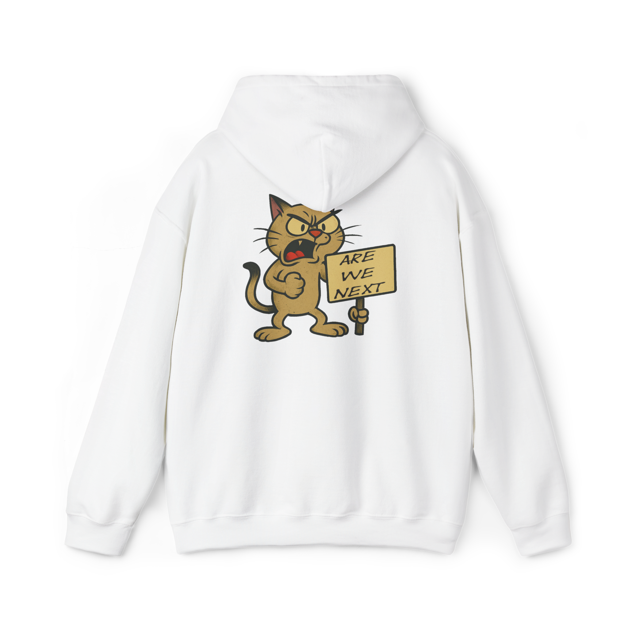 Are We Next?—a hoodie that asks the big question through the angry eyes of a fed-up cartoon cat. Whether it’s a protest, a movement, or a meltdown, this cat is all in. And yes, it bites.