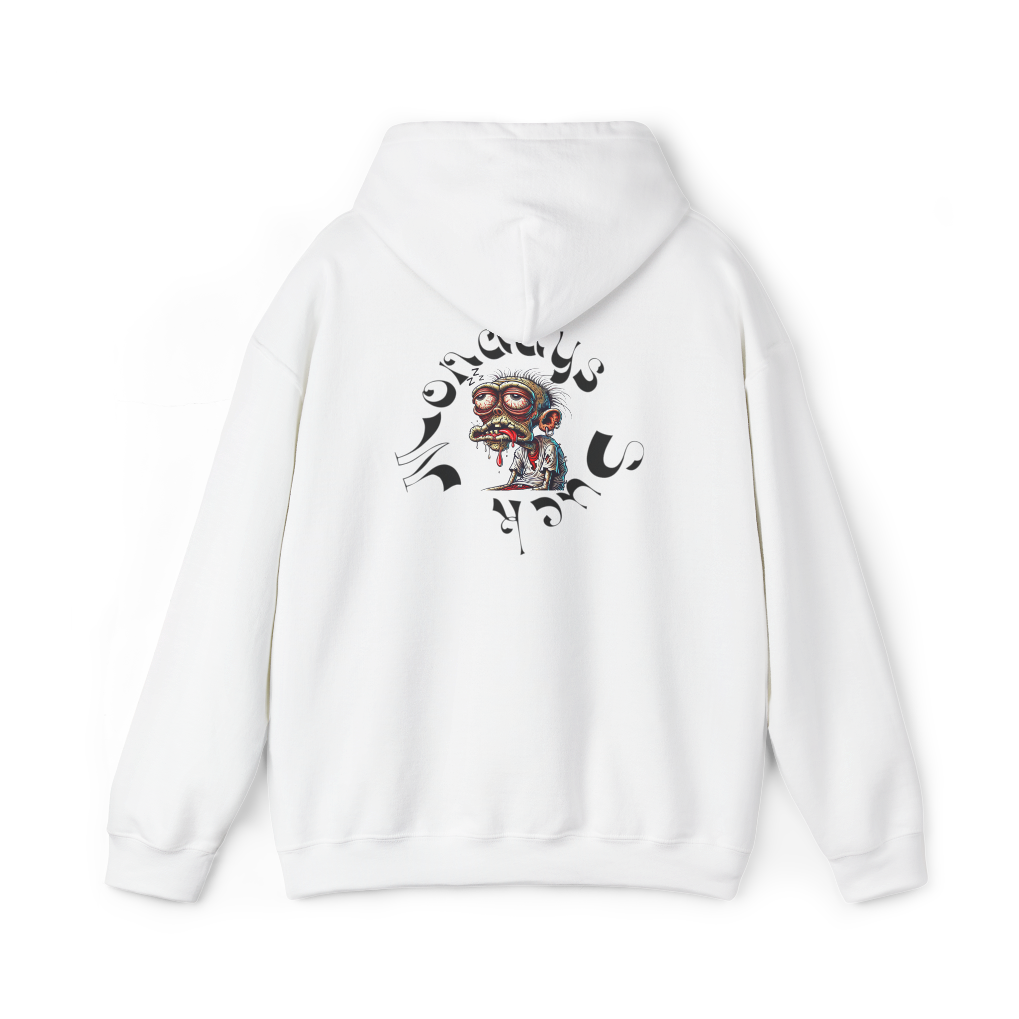 Mondays Tho—the hoodie for anyone who wakes up on Monday looking like they just lost a fight with sleep, caffeine, and sanity. This back-print features a dazed zombie monkey, bug-eyed and dripping with exhaustion, surrounded by warped text that mirrors your mental state.