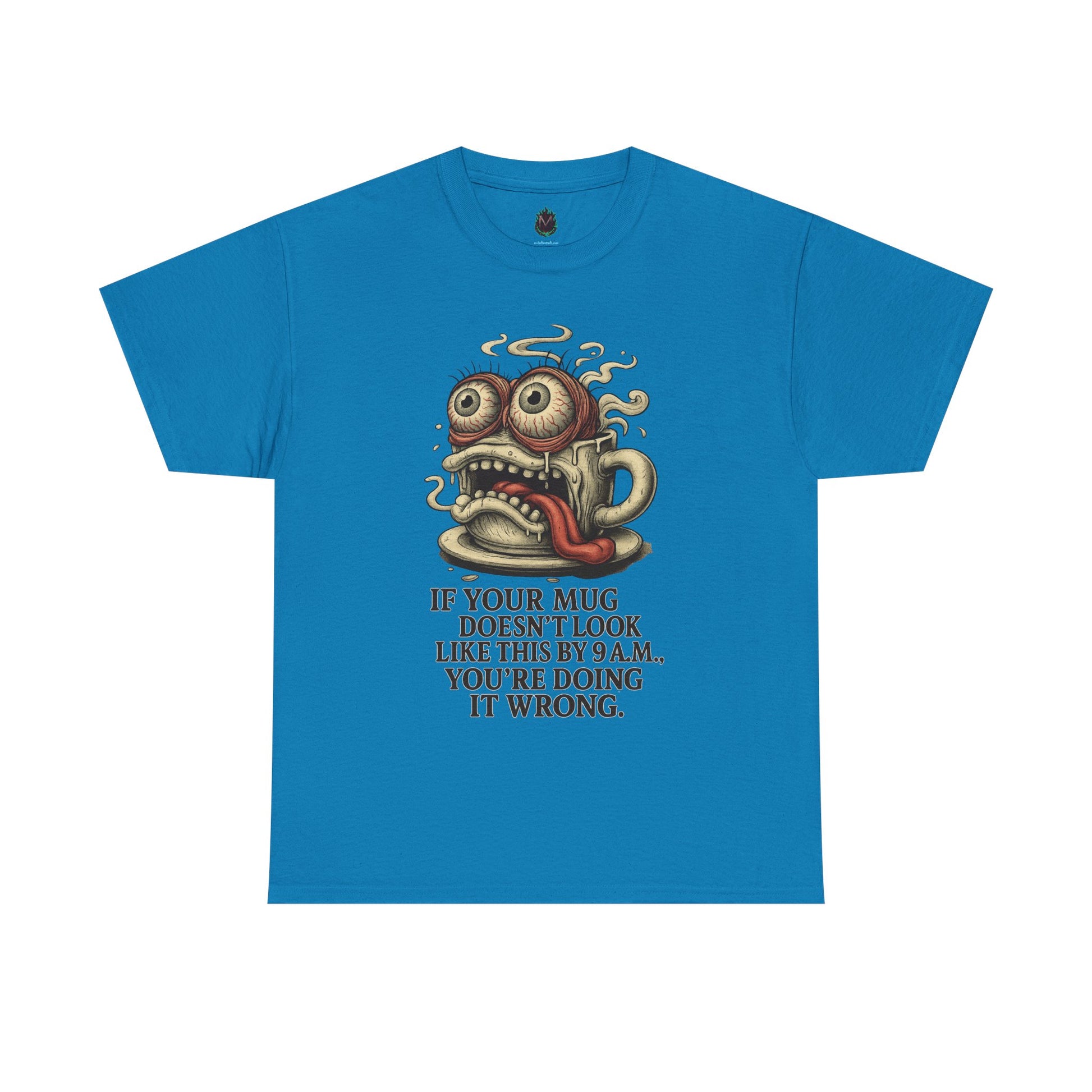Start your day with a jolt of caffeine chaos featuring an overstimulated coffee cup with bloodshot eyes and meltdown energy.