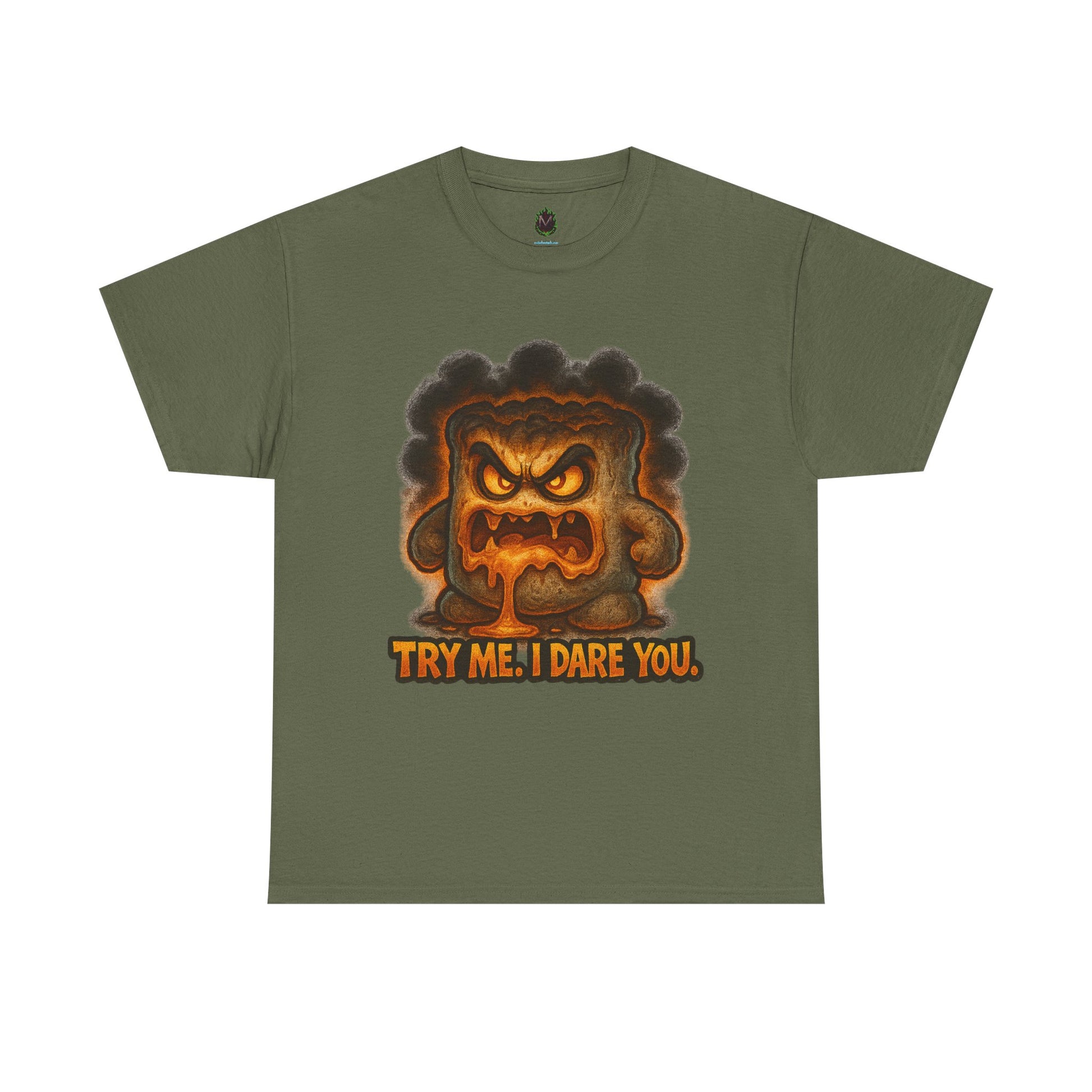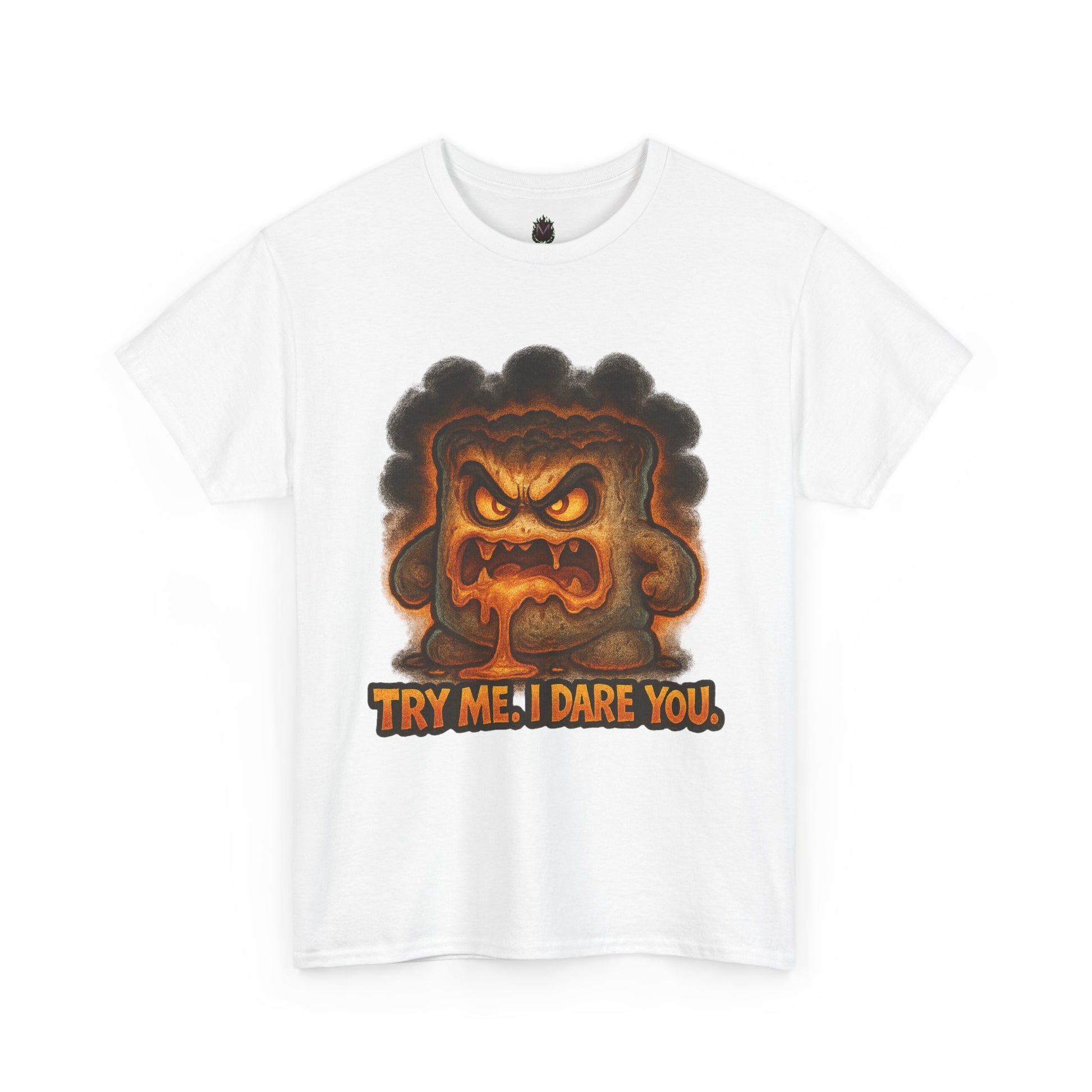 This bold, graphic tee puts gritty attitude front and center. A snarling, toasted-marshmallow character smolders across the chest, eyes blazing with mischief and a drippy, molten edge that feels equal parts campfire lore and late-night skate-sticker energy. The message beneath — short and challenging — lands like a wink to anyone who likes to push limits without taking themselves too seriously. Lightweight but substantial, the shirt wears in comfortably and keeps the print looking vivid. Wear it to backyard bonfires, skate sessions, or low-key nights out to add a little scorch to your everyday rotation.