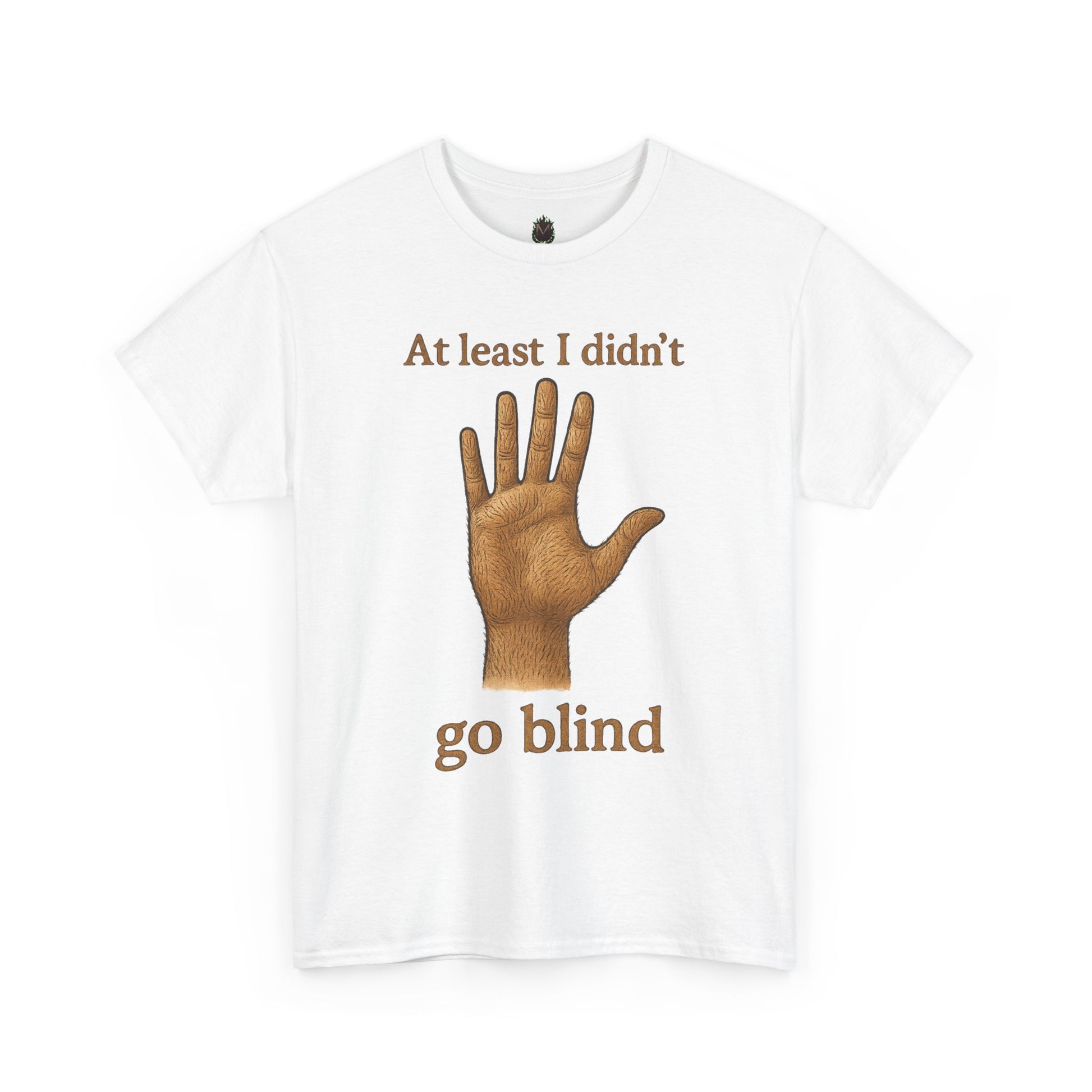 This soft, mid-weight tee carries a wry, dark-humor message with calm confidence. A realistic hand illustration sits between the lines “At least I didn’t” and “go blind,” rendered in warm brown tones that contrast gently against the natural white fabric. The classic crew silhouette and relaxed fit make it easy to wear on slow mornings, road trips, or low-key hangouts. It feels lived-in from the first wear: breathable cotton, a ribbed collar that holds its shape, and a tear-away label so nothing irritates your neck. Subtle details like shoulder twill tape and a clean, tubular construction keep the shirt looking tidy after many washes. Wear it when you want to riff with friends, break the ice with dry humor, or lean into a bit of ironic storytelling in your everyday wardrobe.